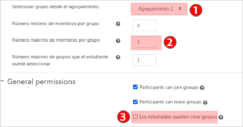 - Se desmarca la casilla "Los estudiantes pueden crear grupos" (3)