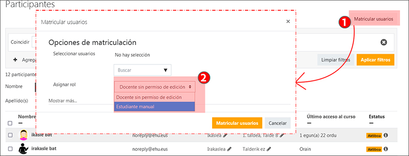 Para realizar matriculaciones en eGela en los roles “Docente sin permiso de edición” y “Estudiante manual” acceder a Participantes y pulsar sobre “Matricular usuarios” (1). Un menú emergente permite realizar la búsqueda y la guardar la matriculación. Se pueden elegir los roles “Docente sin permiso de edición” y “Estudiante manual” en el campo “Asignar rol” (2).