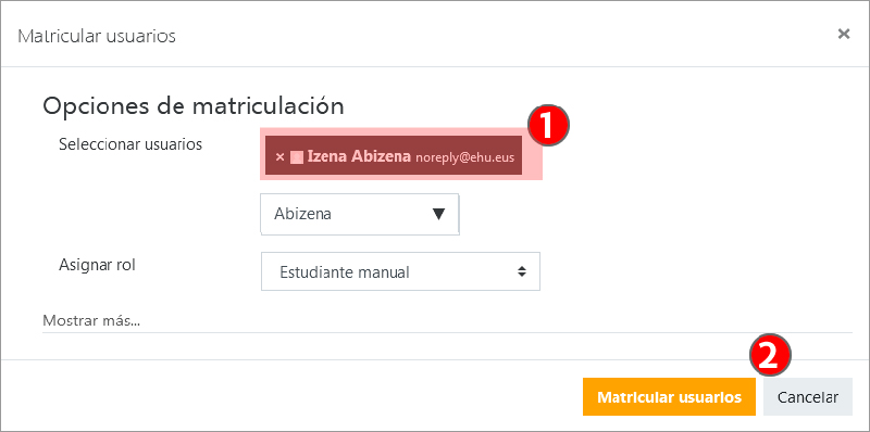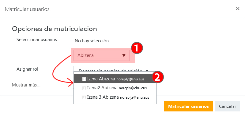 Después de seleccionar el rol con el que se va a matricular a los usuarios en el curso, introducir en el campo “Seleccionar usuarios” (1) una cadena de texto relacionada con el nombre, el apellido o la dirección del correo electrónico. En la lista de resultados (2) pulsar sobre los usuarios que se deseen matricular.