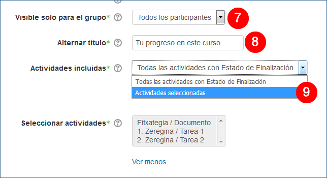 - Eligiendo la opción “Actividades seleccionadas” se pueden seleccionar los elementos a incluir en la barra entre aquellos que tengan configuración de finalización de actividad. Para seleccionar más de un elemento o deseleccionar elementos utilizar la tecla Ctrl.