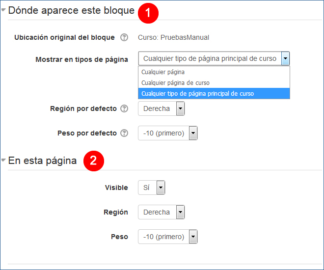También se puede encontrar en la página de ajustes del bloque las opciones para situar el bloque en un lugar específico de las columnas laterales izquierda y derecha. En la imagen siguiente se han marcado las opciones para situar el bloque en la parte superior de la columna derecha y solo en “Cualquier tipo de página principal del curso”, evitando así que aparezca en página de recursos o actividades que no tienen por defecto columna lateral derecha.