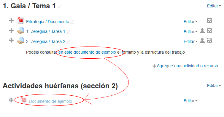 Una sección huérfana es una sección con contenido que ha quedado fuera del número de secciones establecido para el curso. Por ejemplo, un curso con una única sección pero que sección número dos tiene un documento.