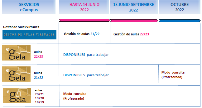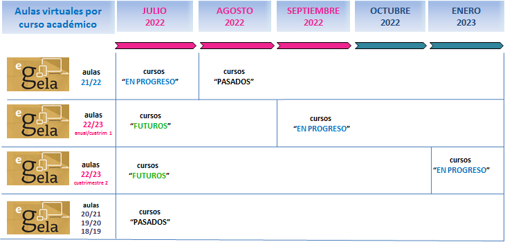 Todas las aulas virtuales en eGela tienen una fecha de inicio (septiembre o enero) dependiendo del calendario marco de cada curso académico y del tipo de asignatura (cuatrimestral, anual), y una fecha de fin que por defecto es el 31 de julio. Estas fechas son las que marcan que el aula virtual se clasifique en eGela como curso:
