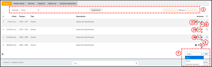 También se pueden seleccionar distintas sesiones y mediante el menú (7) eliminar las seleccionadas o modificar la duración de las mismas.