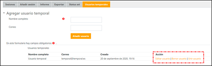 Los usuarios temporales que se hayan creado se pueden editar, borrar o unir a un usuario existente en eGela.