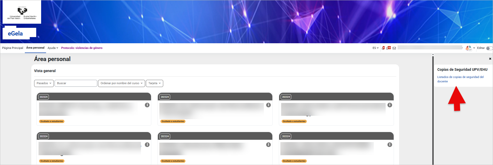 En el lateral derecho del “Área personal”, acceder al “Listado de copias de seguridad”.