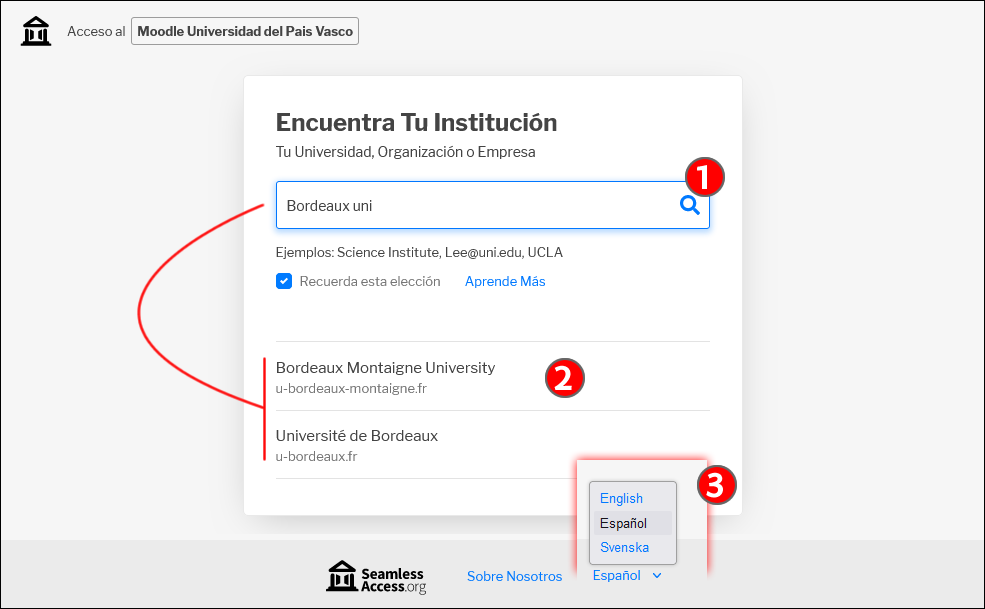Al pulsar sobre “Acceso con cuenta externa” se accede a un nuevo formulario con un campo de búsqueda (1) para encontrar la institución de origen. El campo de resultados (2) mostrará las instituciones con nombres que tengan coincidencias con la cadena introducida. Al pulsar sobre uno de los resultados se accederá al formulario de identificación de origen, donde se podrán introducir las credenciales correspondientes. Una vez completada la identificación, se accede a la plataforma eGela PI.