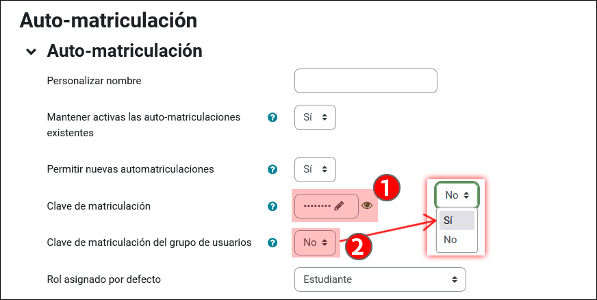 En la imagen siguiente se muestran parte de los campos de configuración de un “Método de auto- matriculación”. Si se especifica una “Clave de auto-matriculación” (1) para cada método y se marca el campo “Clave de matriculación del grupo de usuarios” (2) como “Sí”, los usuarios que se matriculen con este método se incluirán en el grupo correspondiente. Ver los ajustes correspondientes en el grupo en el apartado “Grupos” del manual “Gestión de usuarios en eGela: Participantes, Grupos y Matriculación”.