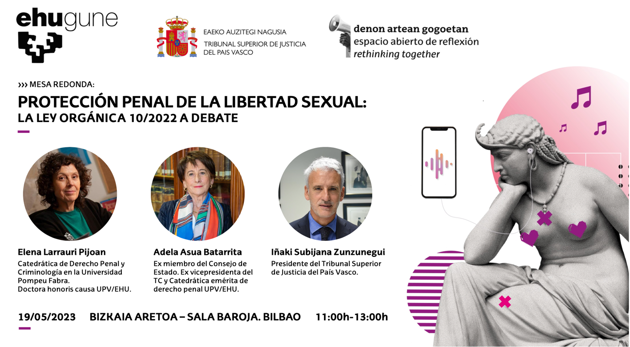 En la mesa redonda, moderada por Enara Garro, profesora titular de Derecho Penal de la UPV/EHU y directora del Departamento de Derecho Público, participarán Elena Larrauri, catedrática de Derecho Penal y Criminología de la Universidad Pompeu Fabra, nombrada recientemente doctora honoris causa por la UPV/EHU; Adela Asua, catedrática emérita de Derecho Penal de la UPV/EHU y ex miembro del Consejo de Estado; y el magistrado Iñaki Subijana, presidente del Tribunal Superior de Justicia del País Vasco.