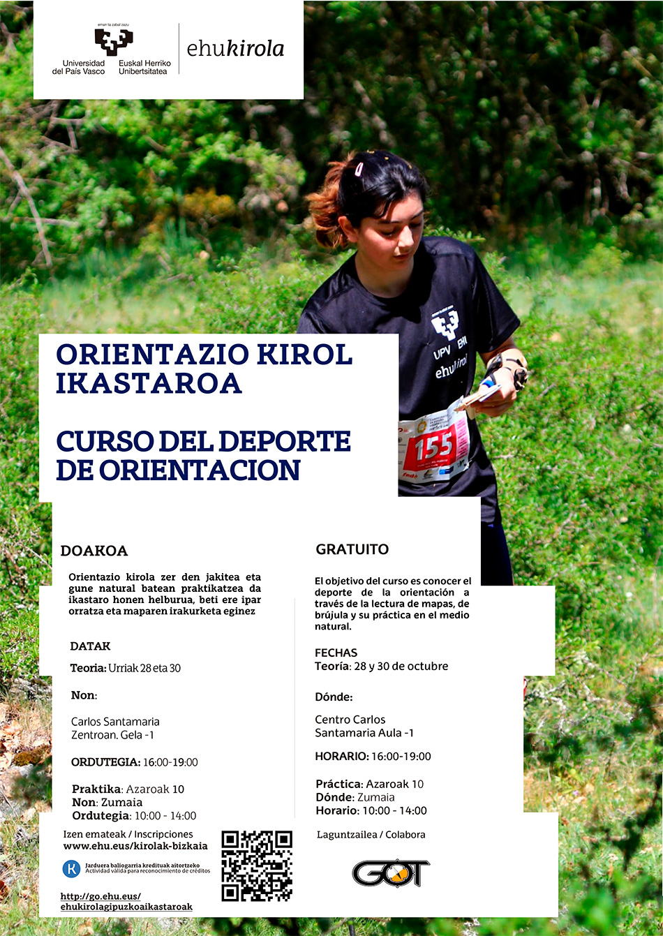 El objetivo de este curso es conocer el mundo del deporte de la orientación, la parte teórica y práctica. Las pruebas de orientación se realizan tanto en aire libre, como en sitios cerrados, donde mediante la ayuda de un mapa y brújula, el participante deberá encontrar diferentes puntos de control. El curso trata de 6 horas teóricas en el Campus de Gipuzkoa y una prueba de 4 horas en el municipio de Zumaia.