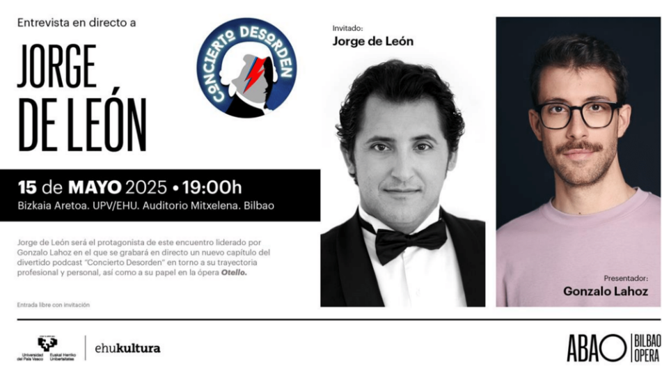 Jorge de León será el protagonista de este encuentro liderado por Gonzalo Lahoz en el que se grabará en directo un nuevo capítulo del divertido podcast “Concierto Desorden” en torno a su trayectoria profesional y personal, así como a su papel en la ópera Otello.