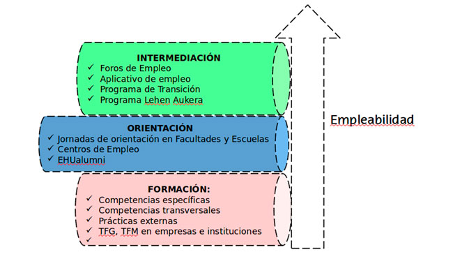 El I Plan para la empleabilidad del alumnado y personas tituladas de la UPV/EHU se desarrolla en base a tres ejes que reflejan una secuencia temporal a lo largo de los estudios, a punto de finalizarlos o tras titularse: