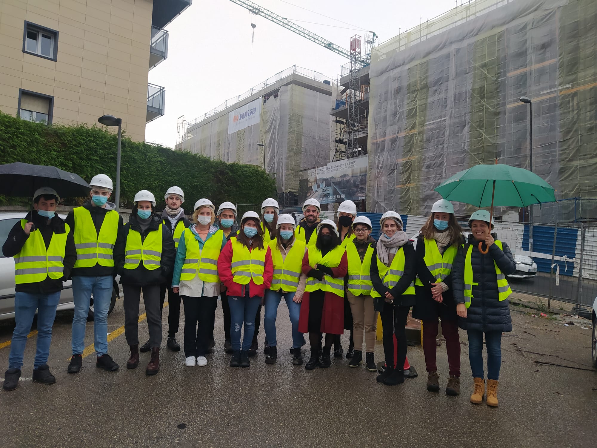 El alumnado de tercer curso del Grado en Arquitectura Técnica visita la obra de construcción de viviendas en la antigua clínica del Pilar que lleva a cabo la empresa SUKIA. La visita se centró en aspectos de seguridad: protecciones colectivas, individuales, medios auxiliares, etc.