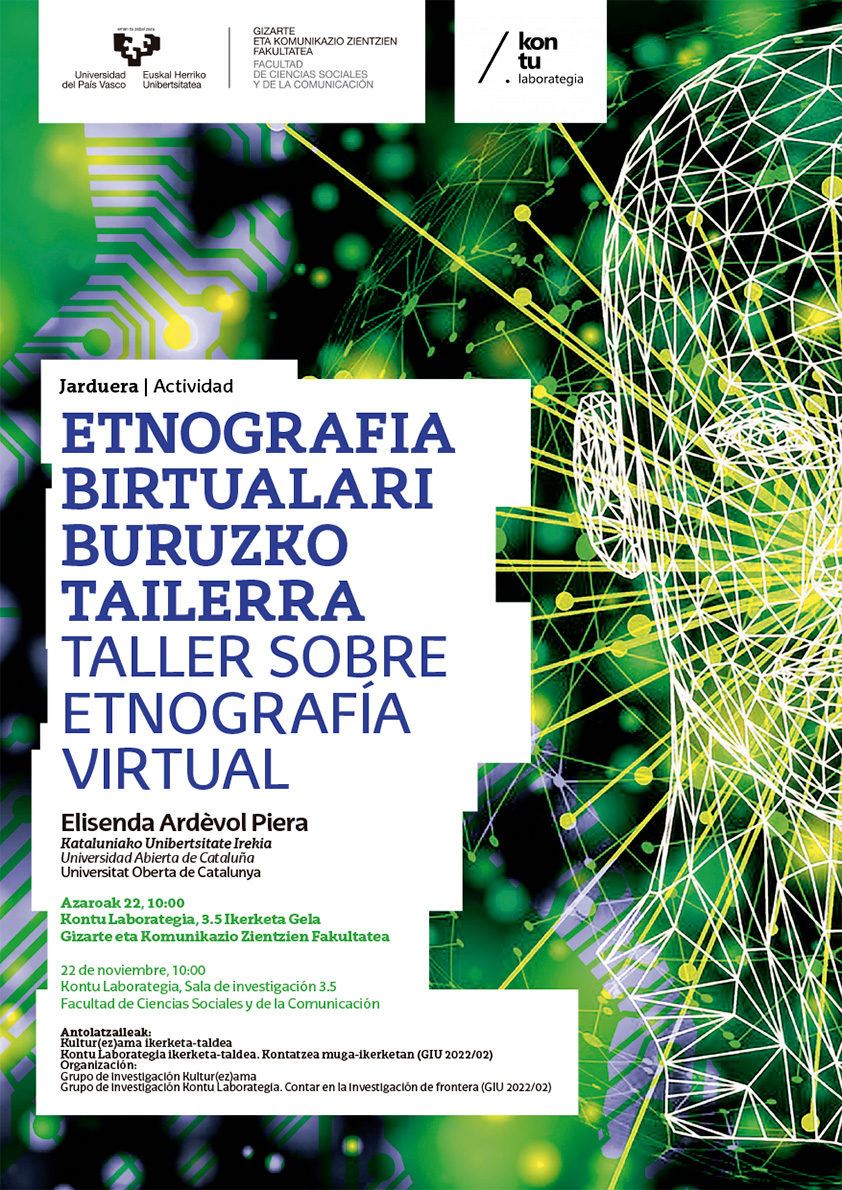 Actividad: "Taller sobre etnografía virtual" Fecha 22/11/2023, 10:00 Compartir en Facebook - (Abre una nueva ventana) Compartir en Bluesky - (Abre una nueva ventana) Compartir en Linkedin - (Abre una nueva ventana) Compartir en Whatsapp - (Abre una nueva ventana) Compartir en Telegram - (Abre una nueva ventana) Enviar por correo electrónico - (Abre una nueva ventana) Copiar enlace - (Abre una nueva ventana) 22 de noviembre, 10:00 Kontu Laborategia, Sala de investigación 3.5 Ponente: Elisenda Ardèvol Piera, Universidad Abierta de Cataluña