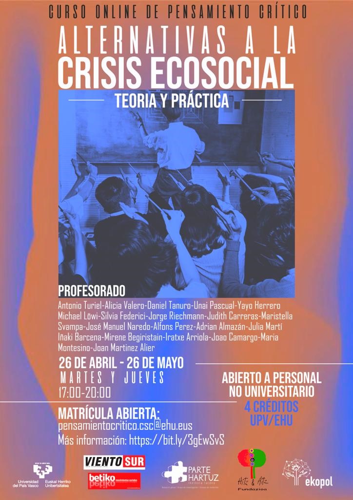 Antonio Turiel (CSIC), Alicia Valero (UNIZAR), Daniel Tanuro (Ingeniero agrónomo y ambientalista, Bélgica) Judith Carreras (EESC), Iratxe Arriola (Gestora I+D+I), José Manuel Naredo (Premio Nacional de Economía y Medio Ambiente), Maristela Svampa (Conicet, Argentina), Alfons Pérez (ODG), Adrian Almazán (EM-EKOPOL), Julia Martí (OMAL), Michael Löwy (CNRS y EHSS, Francia), Silvia Federici (Universidad Hofstra, NY), Jorge Riechmann (UAM), Iñaki Barcena (EKOPOL), Mirene Begiristain (UPV/EHU), Unai Pascual (BC3), Joan Martínez Alier (UAB), Yayo Herrero (EeA), Joao Camargo (CDTM), María Montesino (Socióloga y ganadera).
