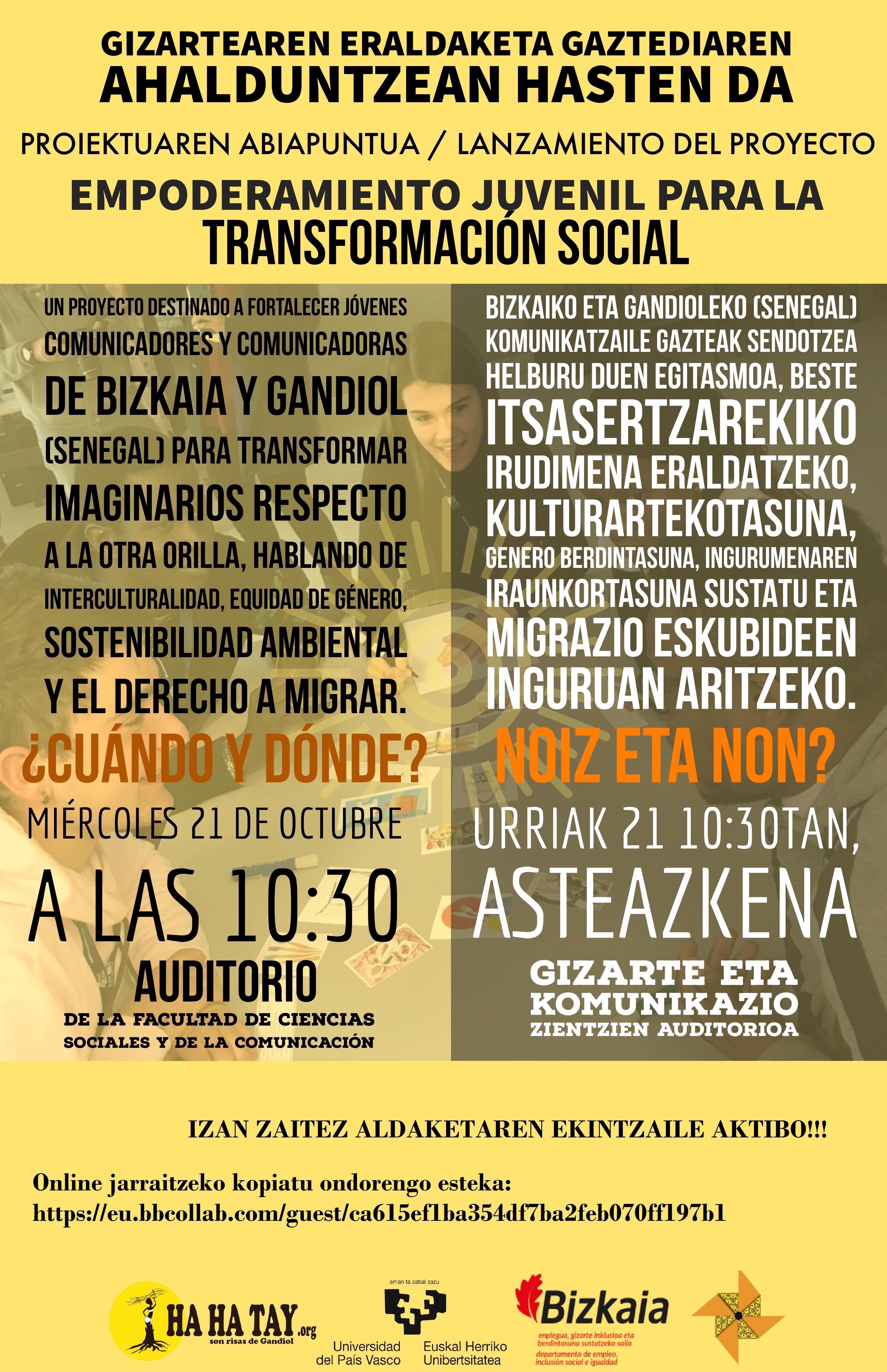 Un proyecto destinado a fortalecer a jóvenes comunicadores y comunicadoras de Bizkaia y Gandiol (Senegal) para transformar imaginarios respecto a la otra orilla, hablando de interculturalidad, equidad de género, sostenibilidad ambiental y el derecho a migrar.