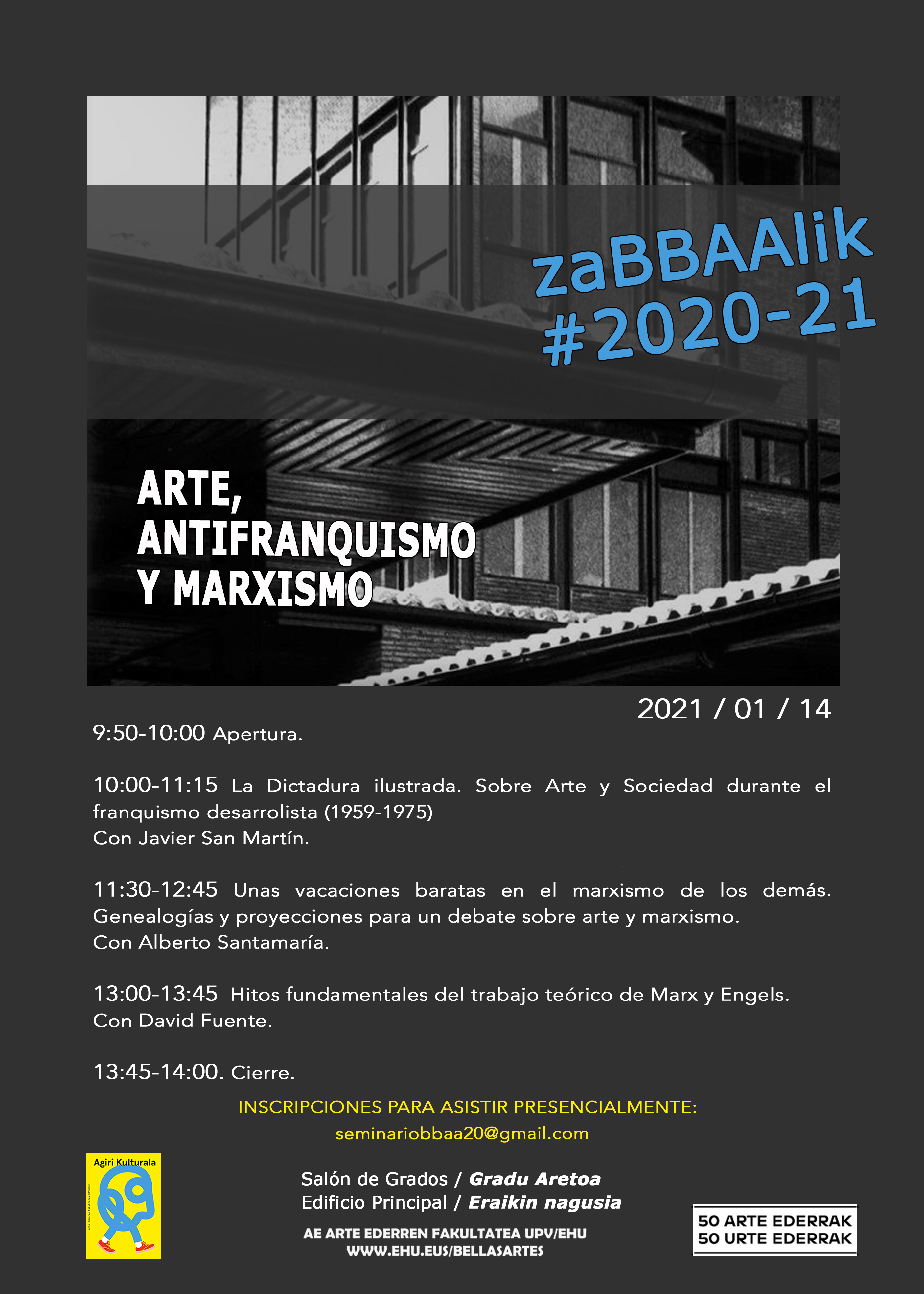 El día 14 de enero, bajo el nombre “Arte, antifranquismo y marxismo”, tendrán lugar tres charlas con los siguientes invitados: el historiador y crítico del arte Javier San Martin, profesor de Teoría e Historia del Arte en la UPV/EHU; el filósofo y poeta Alberto Santamaría profesor de Teoría del Arte en la Universidad de Salamanca; y el investigador en arte y sociología David Fuente.