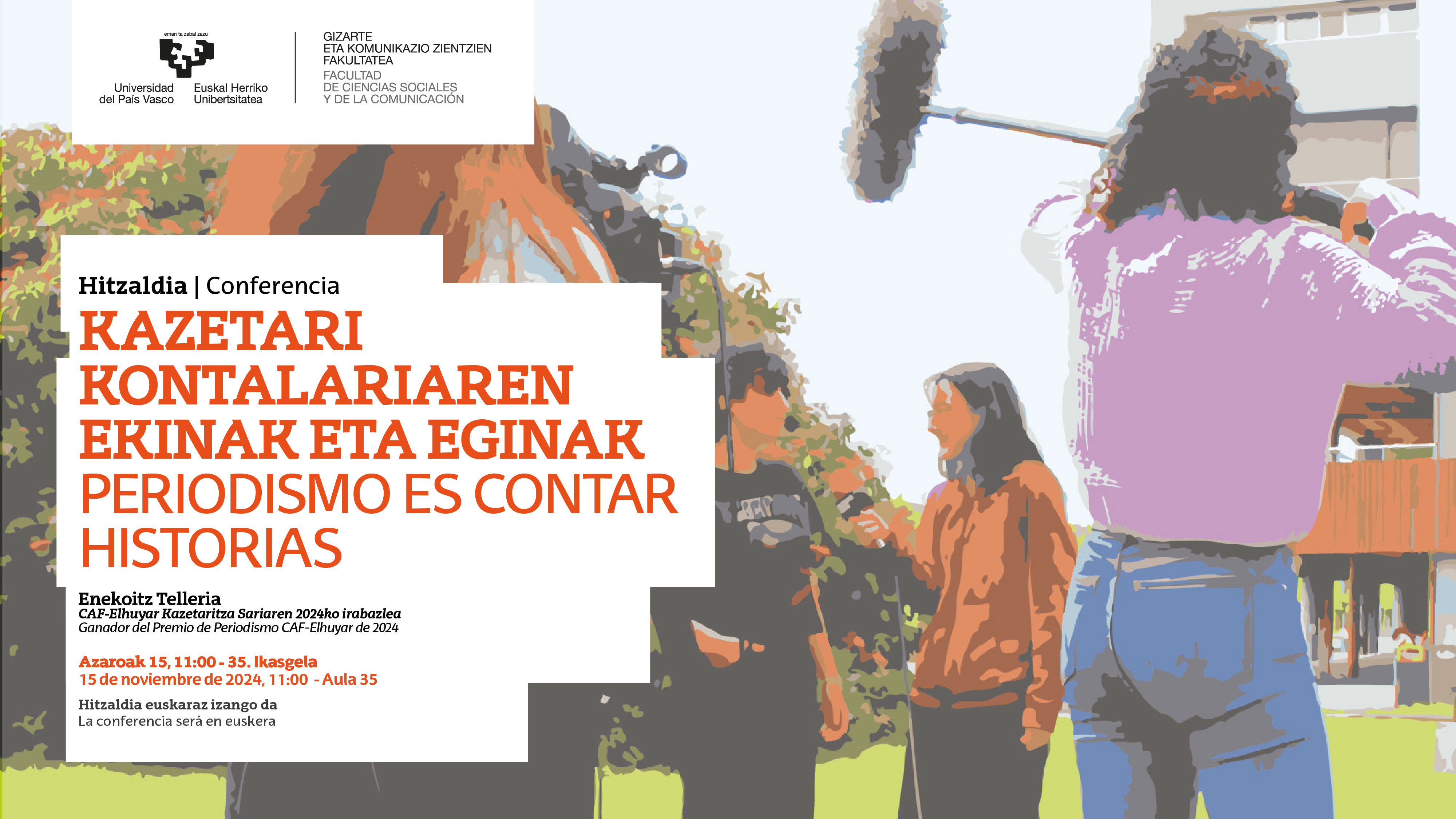 Conferencia Periodismo es contar historias Fecha 15/11/2024, 11:00 Compartir en Facebook - (Abre una nueva ventana) Compartir en Bluesky - (Abre una nueva ventana) Compartir en Linkedin - (Abre una nueva ventana) Compartir en Whatsapp - (Abre una nueva ventana) Compartir en Telegram - (Abre una nueva ventana) Enviar por correo electrónico - (Abre una nueva ventana) Copiar enlace - (Abre una nueva ventana) Ponente: Enekoitz Telleria, Ganador del Premio de Periodismo CAF-Elhuyar de 2024 Fecha: 15 de noviembre, 11:00 h. Lugar: Aula 35 La conferencia será en euskera
