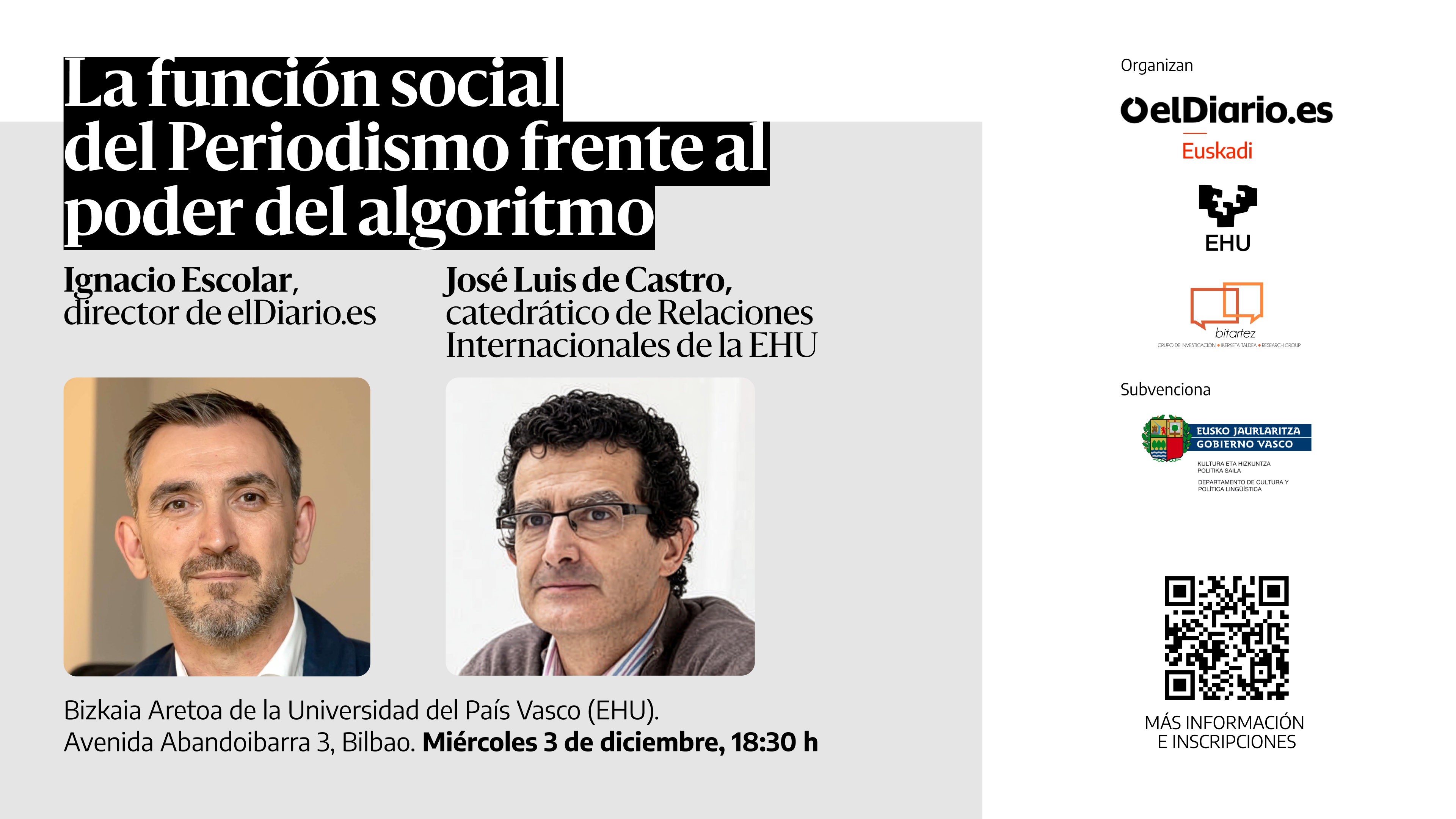 El acto, organizado por elDiario.es y el Grupo de Investigación Bitartez de la Universidad del País Vasco (EHU), se celebrará en el Bizkaia Aretoa (Avenida de Abandoibarra, 3) y está abierto a los socios y lectores de elDiario.es, la comunidad educativa de la Universidad del País Vasco (EHU) y la ciudadanía en general. Si tienes interés en asistir, pincha aquí para reservar tu invitación.