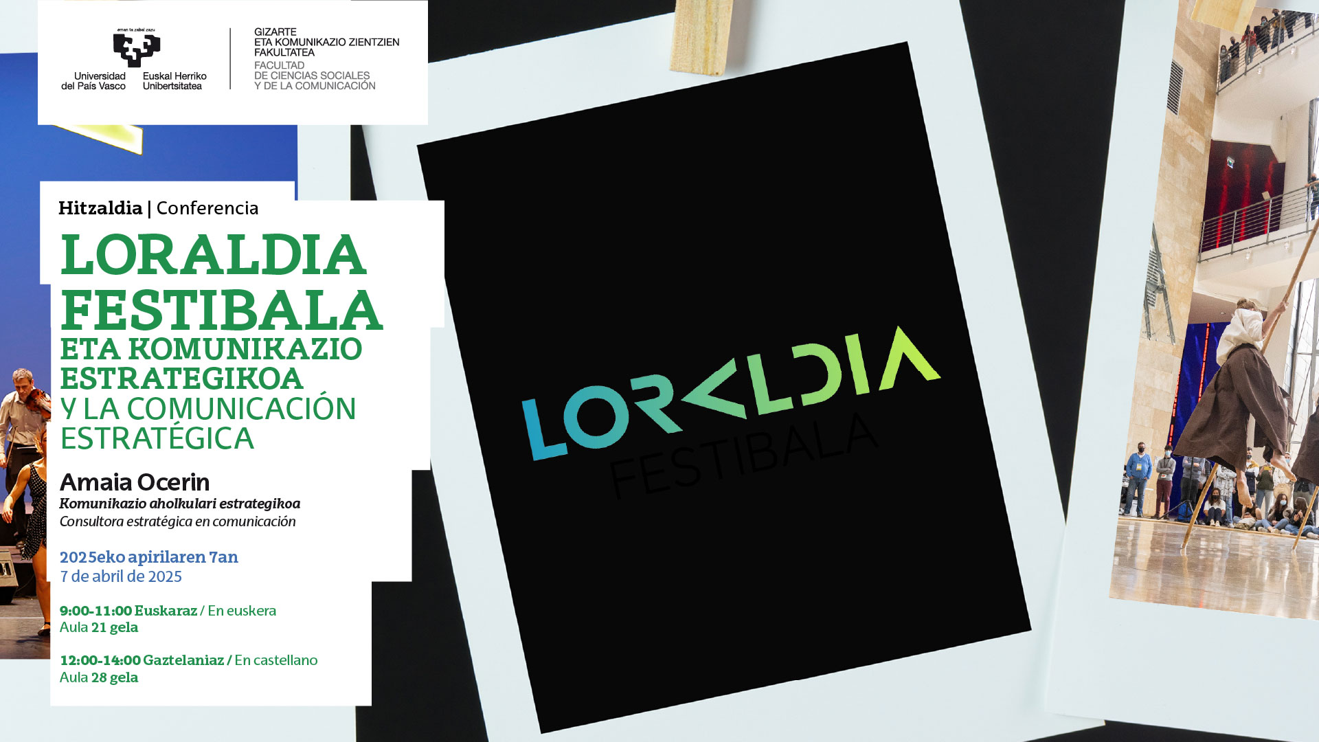 Conferencia de la consultora estratégica en comunicación Amaia Ocerin acerca de la importancia de la realización de un Plan Estratégico de Comunicación en el sector cultural, Loraldia Festibala y su estrategia de comunicación. Actividad enmarcada en el ámbito práctico de la asignatura "Comunicación Estratégica y Operacional".