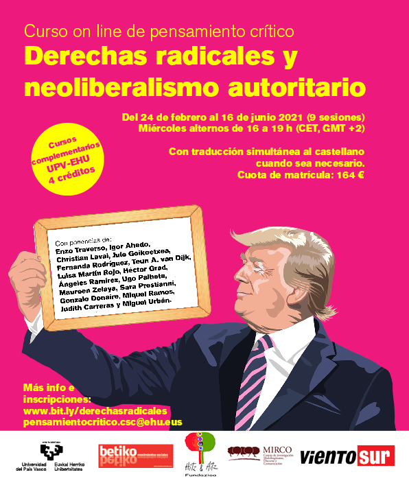 No es un curso de vocación académica, aunque puede ser de interés para quien esté en la Universidad (previsiblemente tendrá reconocimiento de curso complementario de la UPV/EHU con una equivalencia de 4 crétitos). La voluntad es servir de apoyo y para militantes, activistas, estudiantes, personas jóvenes o mayores que quieran formarse para comprender y hacer frente a una de las amenazas más importantes de nuestros tiempos: la derecha radical y el neoliberalismo autoritario.