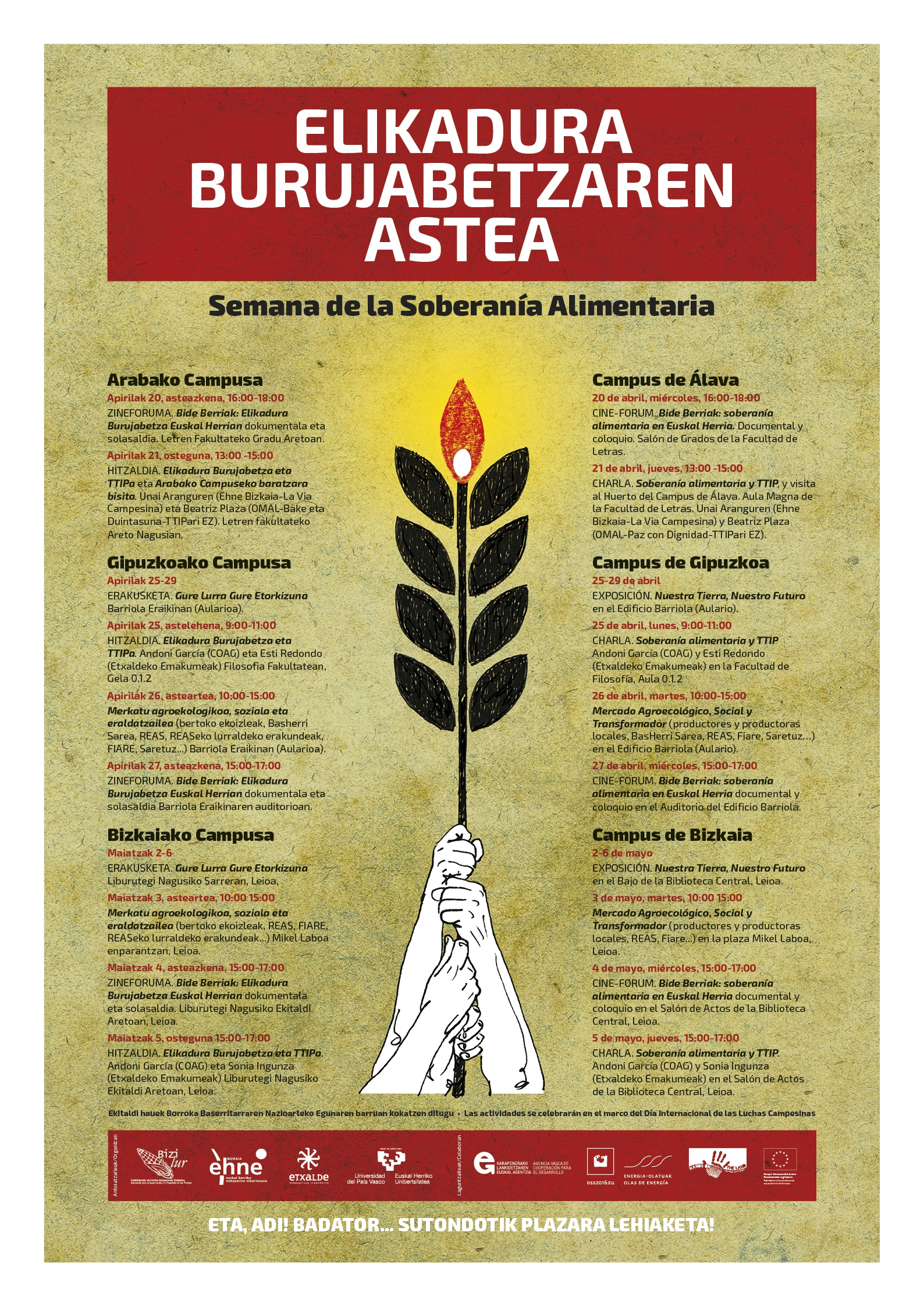 La próxima semana (2-6 de mayo) se celebrará la semana de la Soberanía Alimentaria en el Campus de Leioa con diferentes actividades, entre ellas, un mercado agroecológico, social y transformador el martes en Mikel Laboa. Pero además, habrá la oportunidad de obtener información sobre la soberanía alimentaría con una charla, el documental "Bide Berriak" y la exposición "Nuestra tierra, nuestro futuro". ¡Anímate y hablemos de soberanía alimentaria!