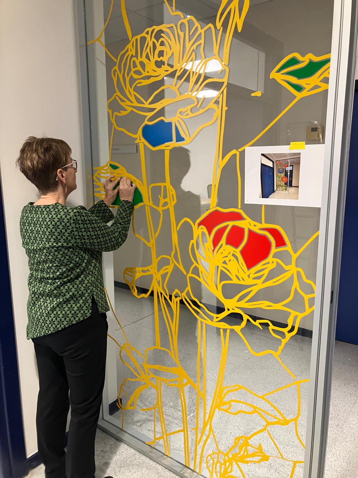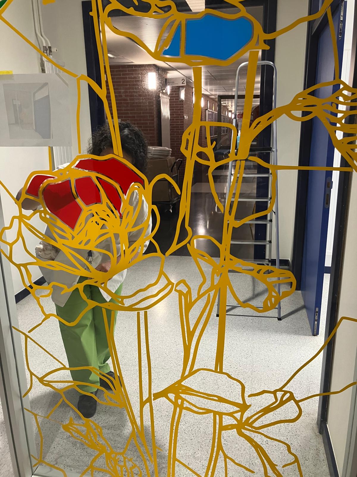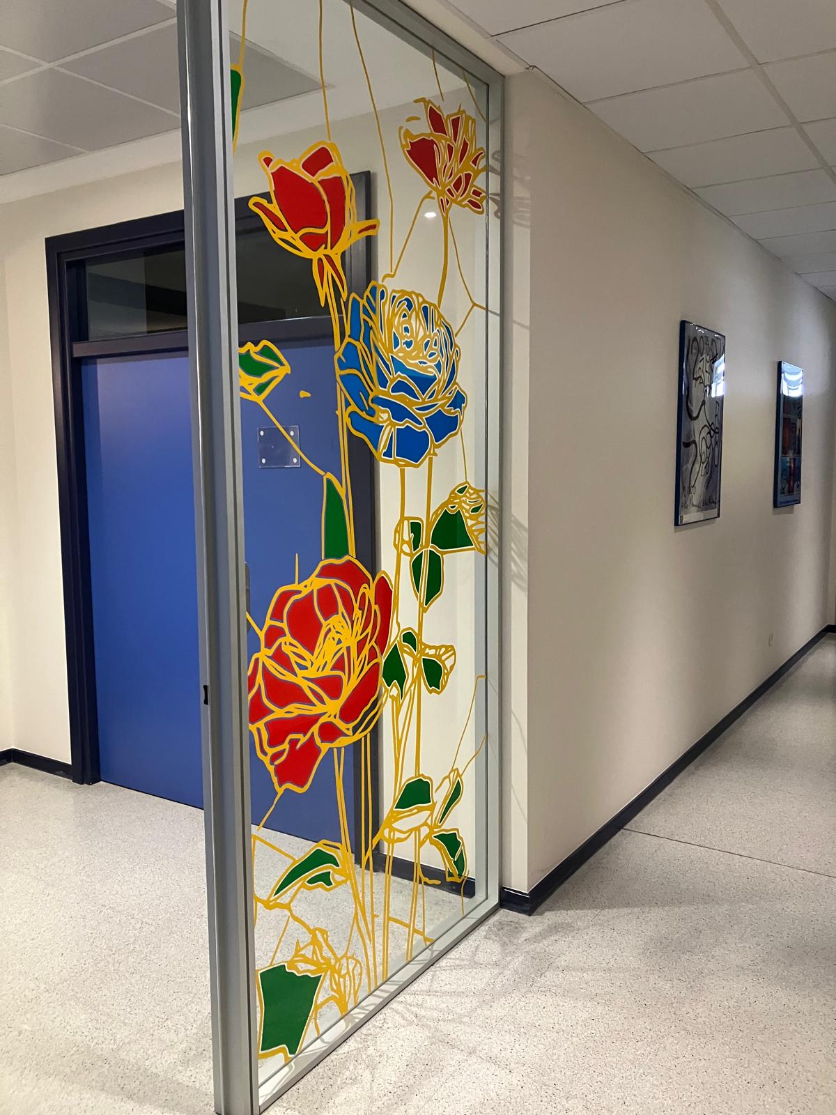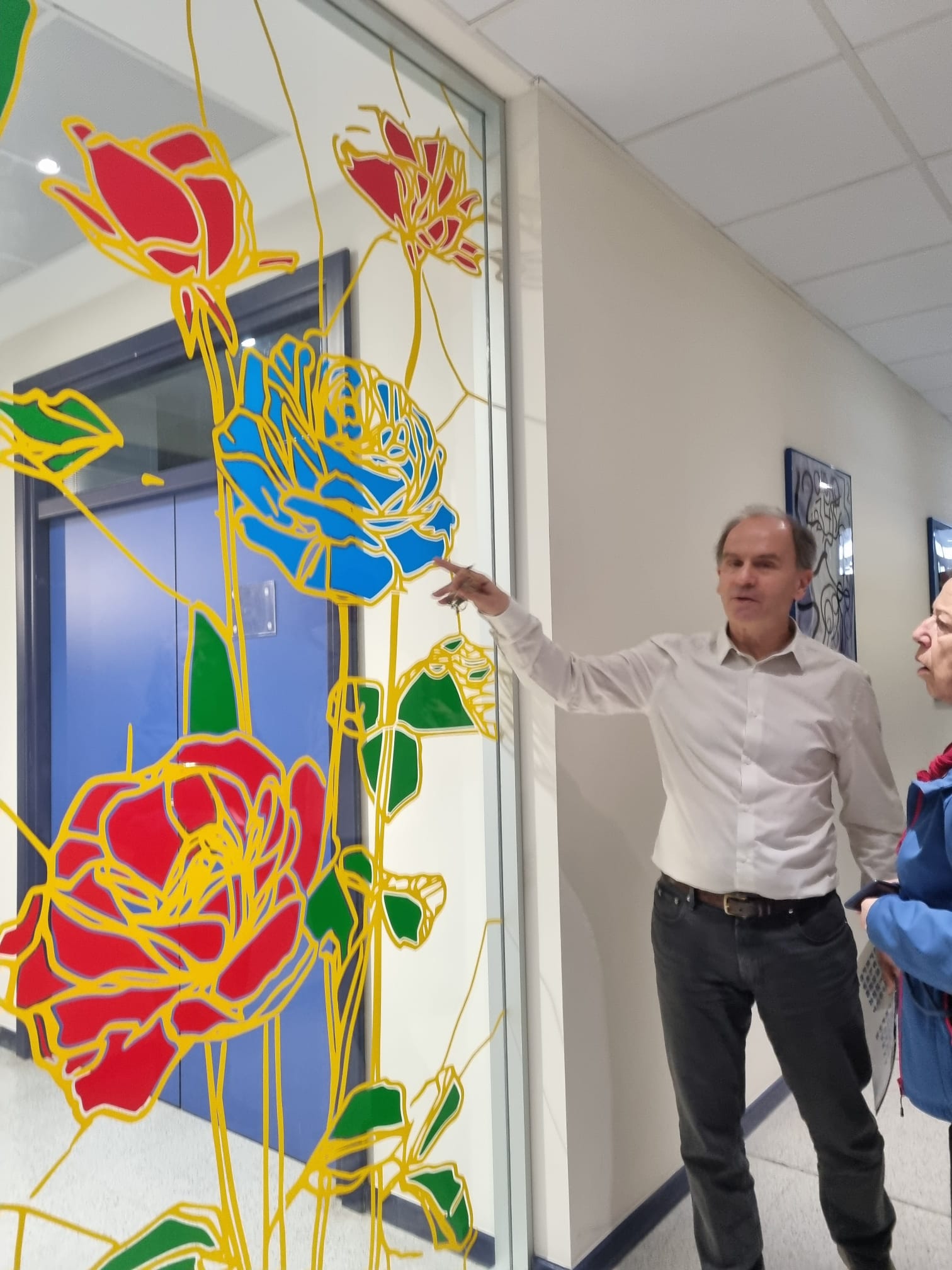 La elección de una iconografía floral —simple, abierta y luminosa— introduce una dimensión poética y cercana en un entorno académico, generando una recepción positiva y alegre por parte del profesorado y de quienes transitan el espacio. La obra no interrumpe el uso funcional del lugar, sino que lo acompaña y lo enriquece, convirtiendo el tránsito cotidiano en una experiencia visual compartida.