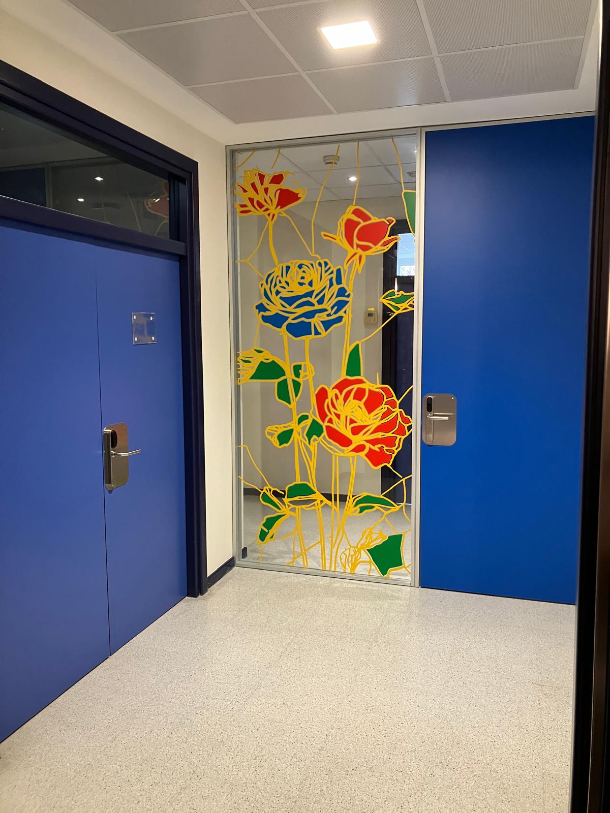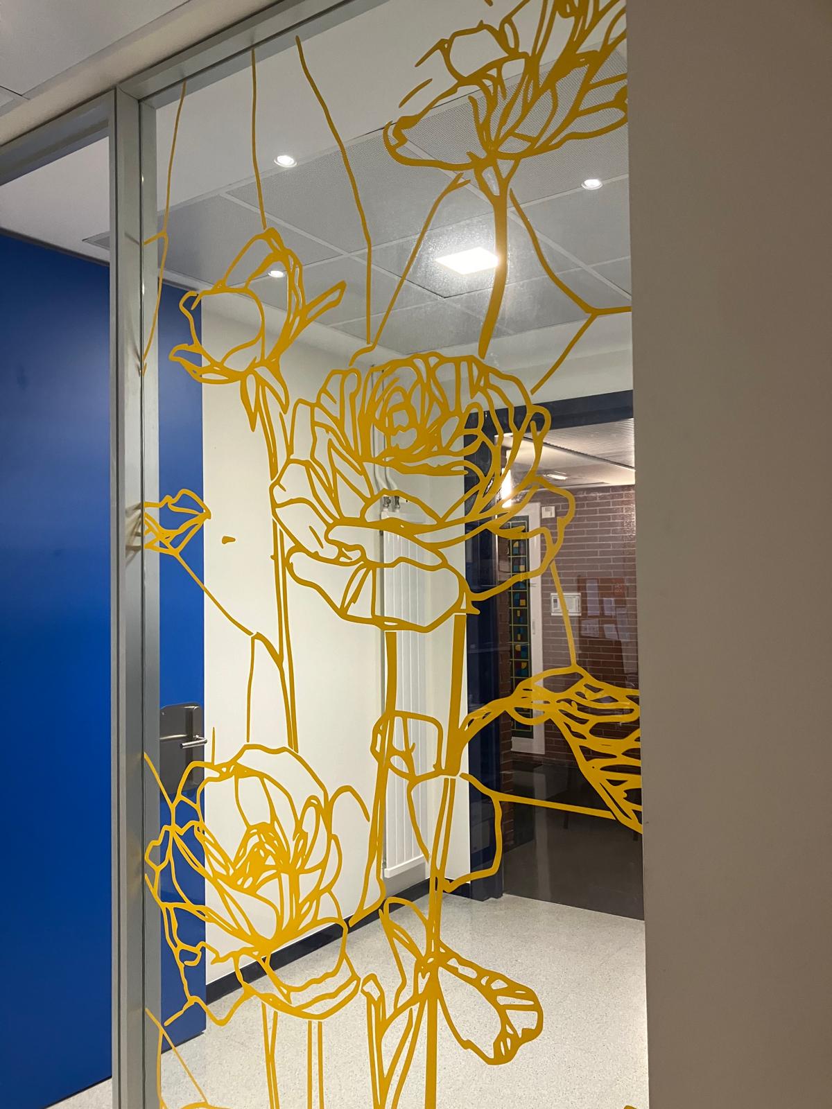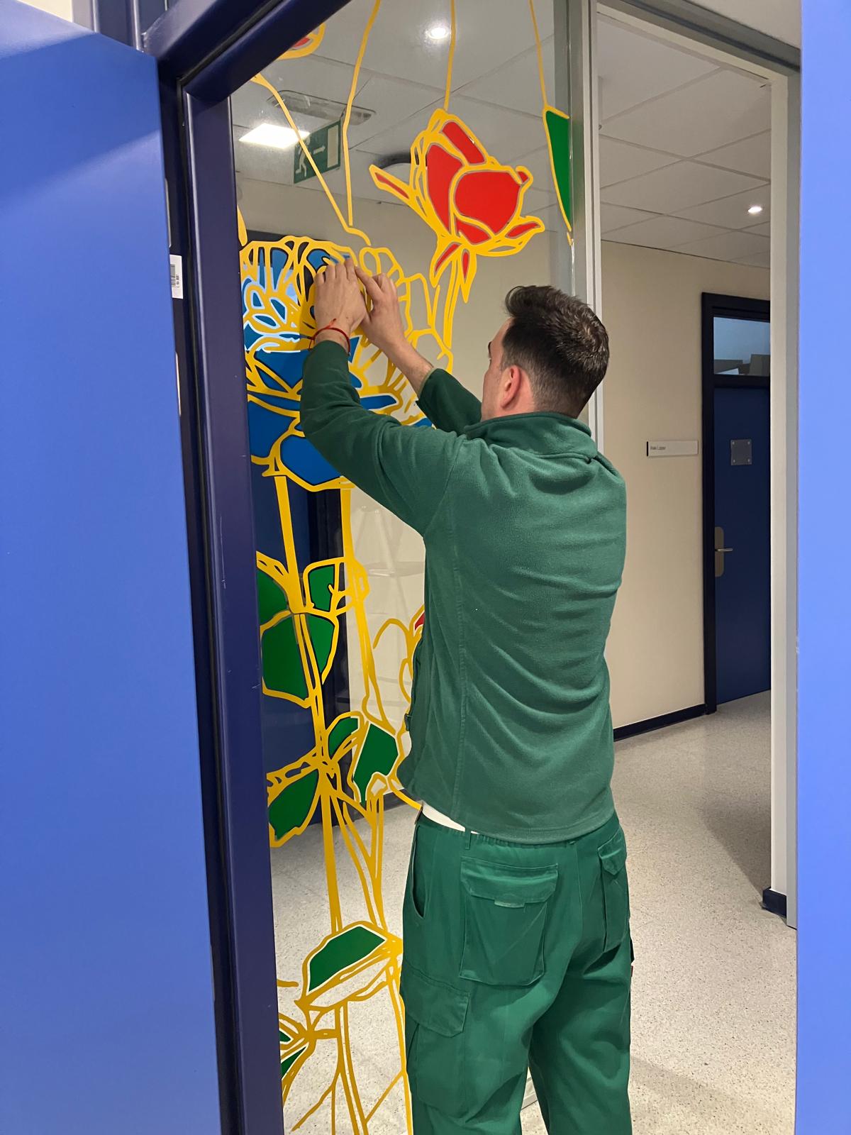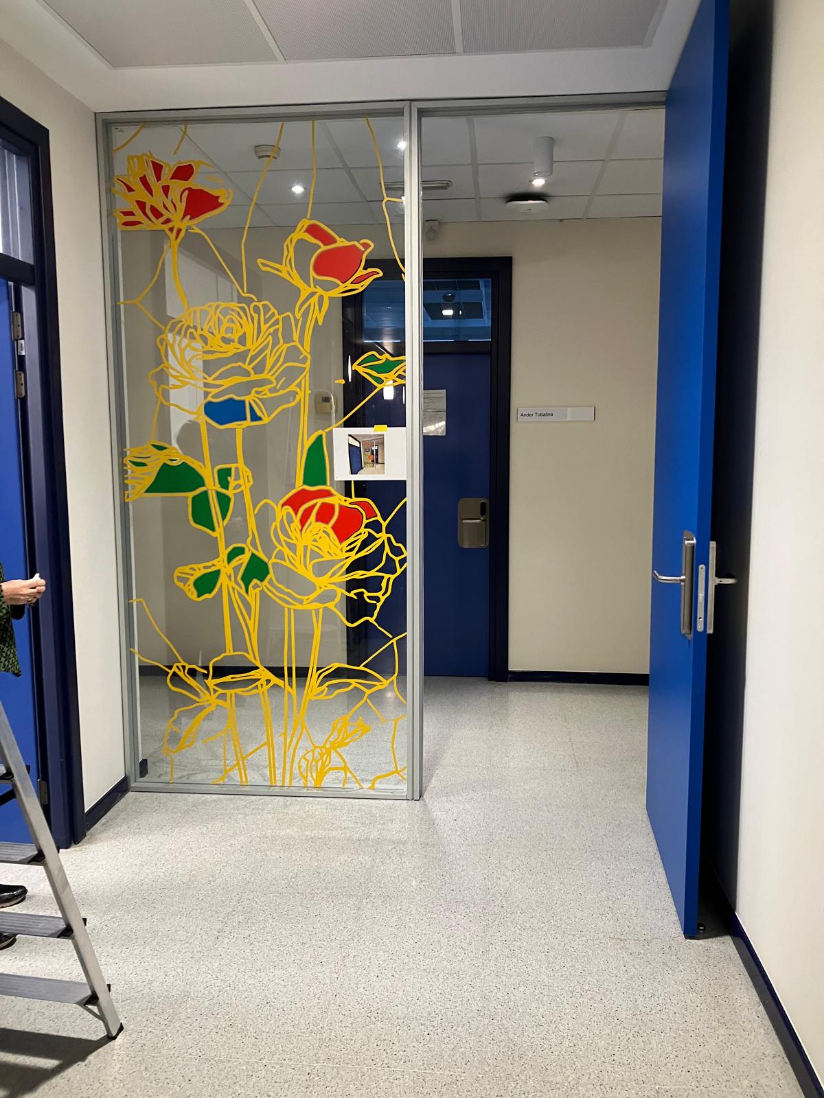 La elección de una iconografía floral —simple, abierta y luminosa— introduce una dimensión poética y cercana en un entorno académico, generando una recepción positiva y alegre por parte del profesorado y de quienes transitan el espacio. La obra no interrumpe el uso funcional del lugar, sino que lo acompaña y lo enriquece, convirtiendo el tránsito cotidiano en una experiencia visual compartida.