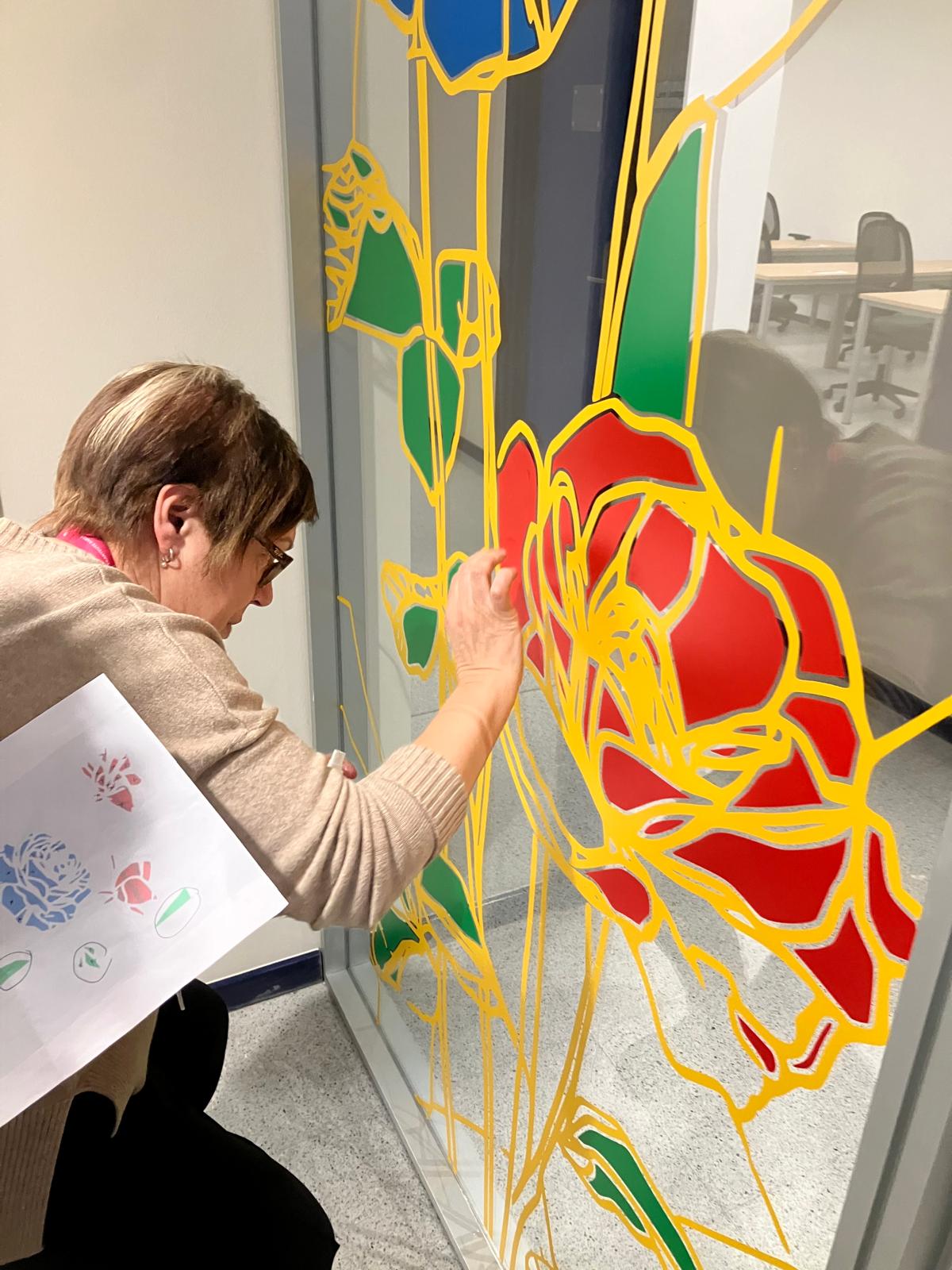 La obra consiste en un mural realizado con vinilo translúcido sobre vidrio, compuesto por cuatro colores básicos, aplicado sobre una superficie de 118 × 275 cm. El motivo principal es un conjunto de cuatro flores de gran formato, representadas de manera abstracta y esencial, reduciendo la forma a lo estrictamente necesario para potenciar la lectura visual del color y la línea.
