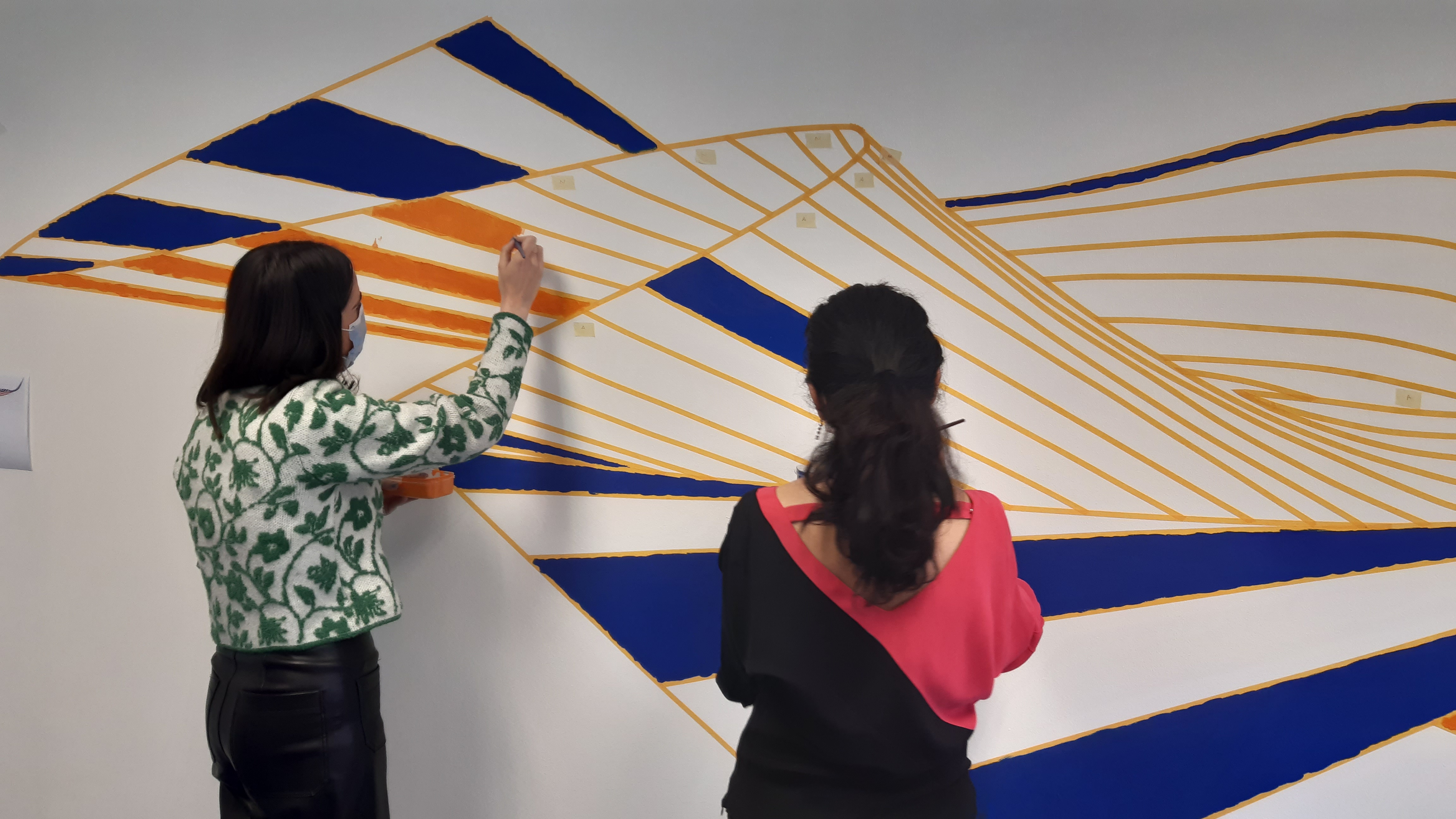 Lenguaje: en este trabajo introducimos un lenguaje minimalista para explorar las posibilidades de expresión artística en el mundo de las superficies manifold. El lenguaje consiste en la representación de franjas rectangulares de dos colores, azul y naranja. Todas las superficies de este Wall Drawing están construidas mediante la utilización de estas franjas rectangulares. Hay un total de 56 franjas sin solapamiento.