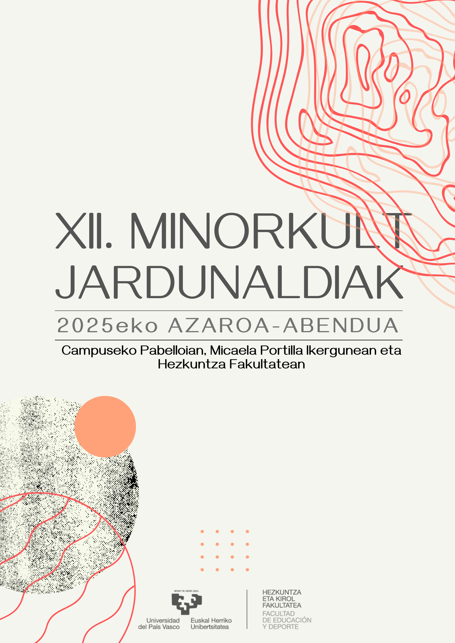 Las Jornadas Minorkult están organizadas por el profesorado de la mención en Educación Intercultural de la Facultad de Educación y Deporte con el principal objetivo de ofrecer experiencias enriquecedoras y formativas a su alumnado de los Grados en Educación Infantil y Primaria. A la jornada de apertura del 3 de noviembre estáis invitadas todas las personas de nuestra Facultad y del Campus Araba. Recordad, nos reuniremos el 3 de noviembre, entre las 9.00 y las 13.30 de la mañana, en el salón de actos de Micaela Portilla.