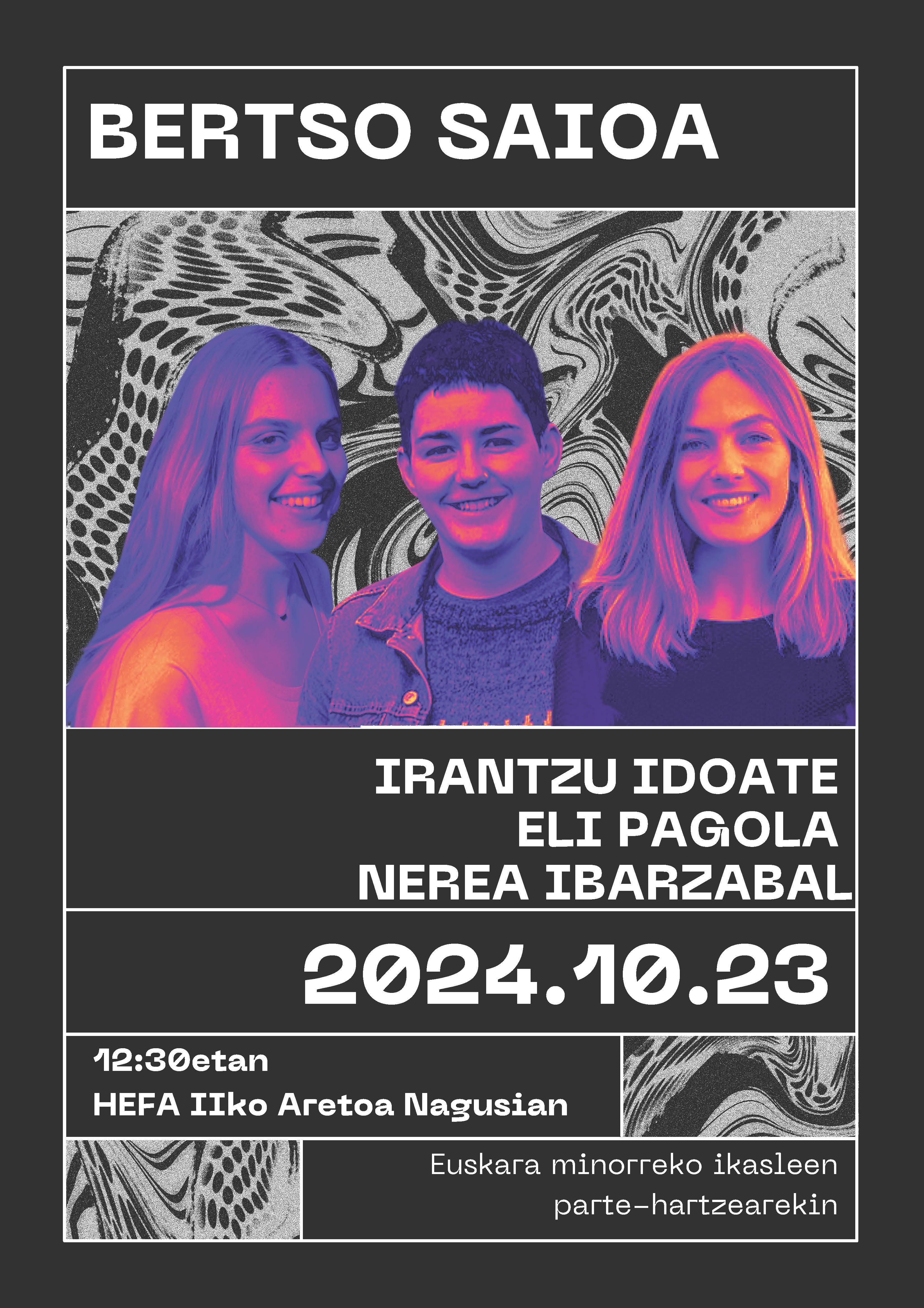 Datorren urriaren 23an, 12:30etan hezkuntzari buruzko bertso-saioa izango dugu Donostiako HEFAIIn, Areto nagusian. Kantuan izango dira Nerea Ibarzabal, Irantzu Idoate eta Eli Pagola, Euskara Minorreko ikasleen gidaritzapean. Sarrera irekia izango da.