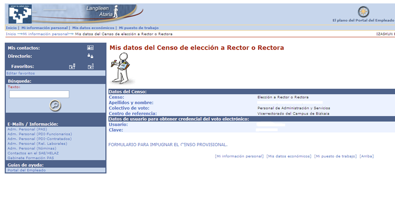 El PDI y PAS podrá consultar el censo también accediendo al Portal del empleado y pinchando sobre la opción "Mis datos del Censo de elección del Rector/a". Aparecen los datos del censo de cada persona, los datos del usuario para obtener la credencial de voto electrónico. Este dato es muy importante para quien quiera votar electrónicamente y no tenga los documentos de identificación –activados- que se admiten (Tarjeta corporativa de la UPV/EHU, DNI electrónico, Tarjeta del Ciudadano o CERES). Por último, también verá el formulario para poder presentar impugnaciones al censo en el caso de que los datos no sean correctos o que el mensaje que aparezca sea "No existen datos del censo en el año académico 2012/2013"