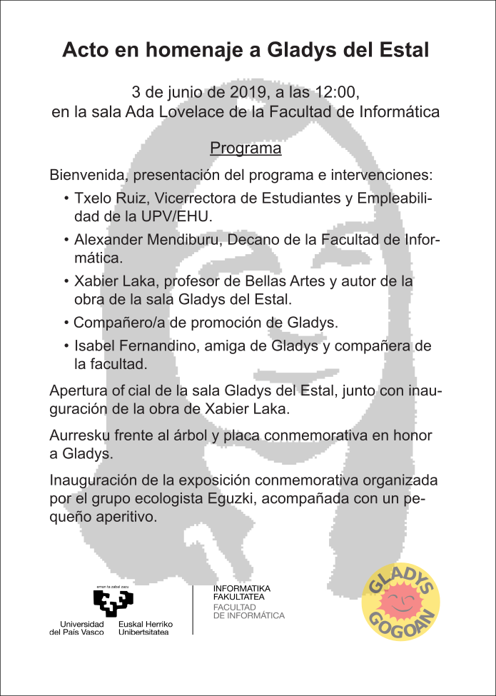 Programa del acto en homenaje a Gladys del Estal que se celebrará en la Facultad de Informática el próximo 3 de junio: