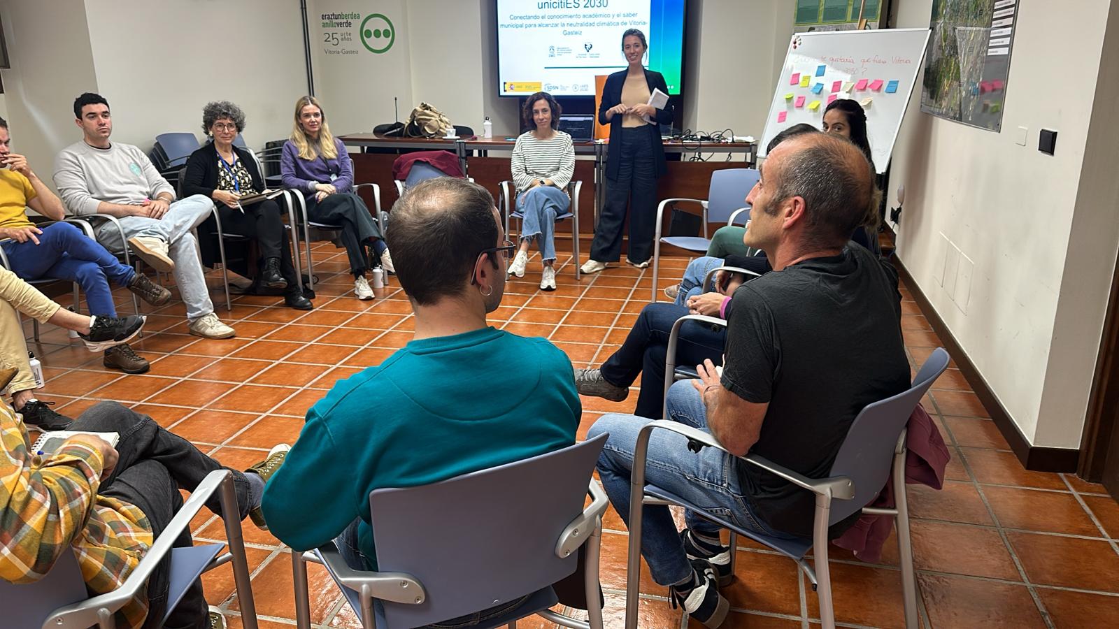El objetivo de la reunión, de carácter informal, fue ser un punto de encuentro para conocer los proyectos y entablar relación entre trinomios (estudiantado, personal técnico del Ayuntamiento de Vitoria-Gasteiz y tutores académicos de la UPV/EHU), así como intercambiar ideas y recursos, de manera que puedan crearse sinergias entre proyectos.