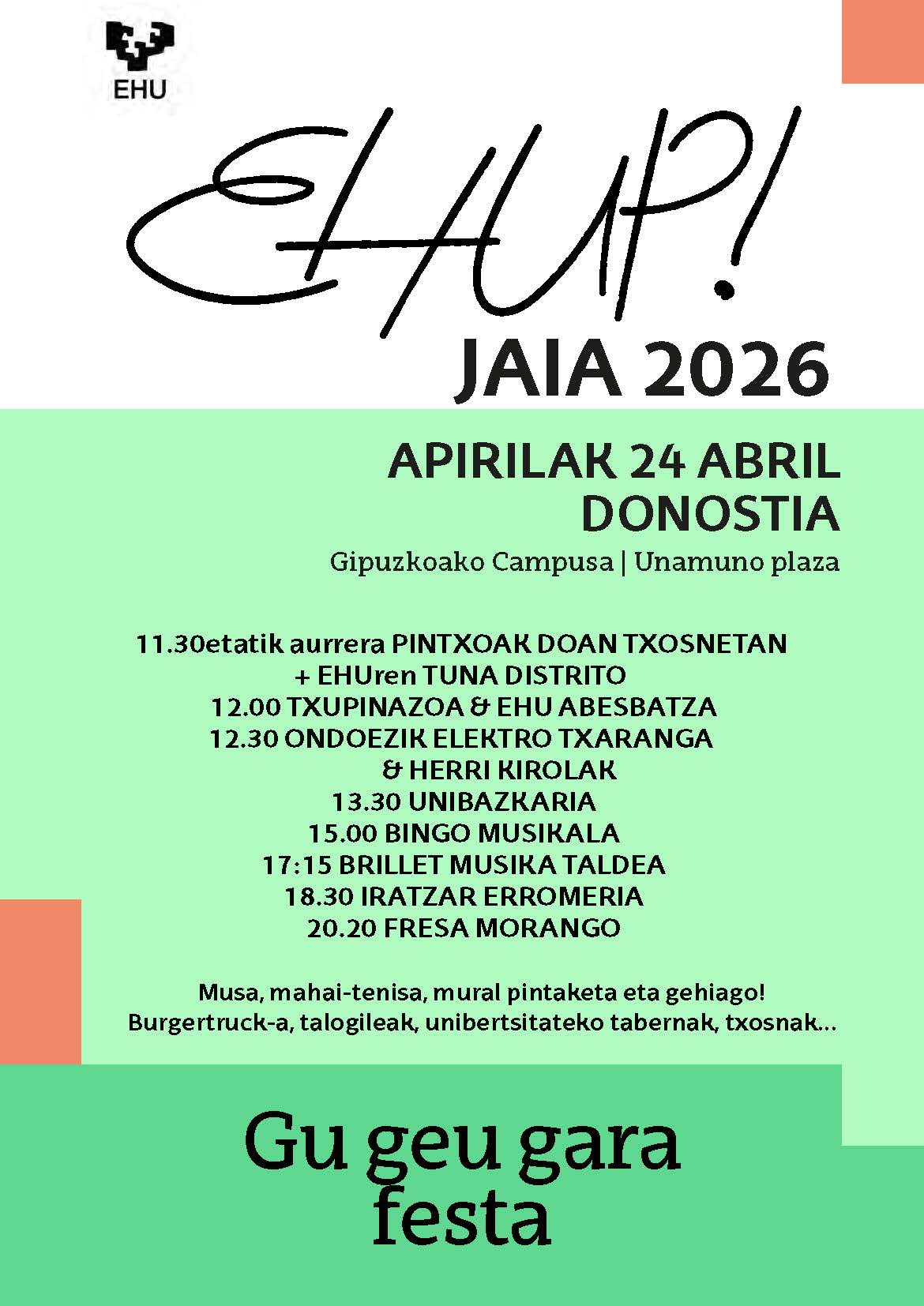 El 24 de abril se celebrará en el Campus de Gipuzkoa la fiesta EHUP! a partir de las 12:00 de la mañana, un evento que busca fomentar la participación y aumentar el sentimiento de pertenencia en nuestra universidad.