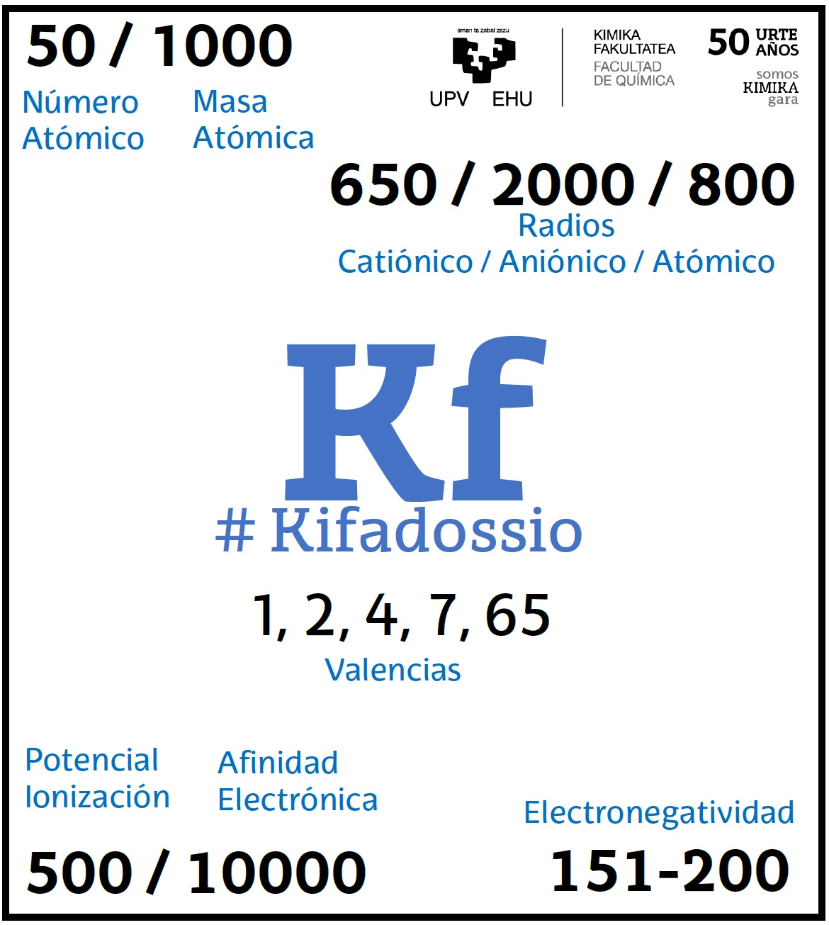¡Qué gran logro se ha conseguido en la Facultad de Química de la UPV/EHU! ¡Gracias al trabajo de muchos años y personas hemos conseguido sintetizar un nuevo elemento químico! Como ha sido una aportación de todos/as, hemos decidido poner su nombre en honor a la Facultad. Así, el nombre de este nuevo elemento químico es KIFADOSSIO. ¿De dónde viene el nombre? Viene de unir el nombre de la Facultad de Química de Donostia San Sebastián en euskera y el sufijo io. Siguiendo con las dos primeras palabras, hemos definido también el símbolo atómico: Kf (Facultad de Química). Hay que tener en cuenta que este importante logro se ha materializado gracias al trabajo comunitario y asociativo y a la aportación de todos los colectivos pertenecientes a la Facultad; investigadores/as, profesores/as, estudiantes, técnicos/as y personal de administración. Este elemento, encontrado de este modo tan particular, tiene propiedades especiales que se describen en los siguientes puntos:
