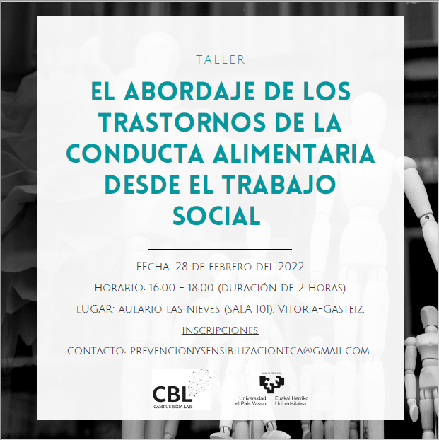 Este taller en torno a los Trastornos de la Conducta Alimentaria y su abordaje desde el Trabajo Social se enmarca en el Proyecto “EHU bienestar psicoSOCIAL” del Campus Bizia Lab (UPV/EHU). Dicho proyecto, busca promover el conocimiento y visibilización de las situaciones de malestar psicosocial y necesidades de atención psicosocial del alumnado en la UPV/EHU, con la finalidad de contribuir a su detección y prevención, a través de propuestas y actividades que redunden en el bienestar psicosocial de la comunidad universitaria siendo una de ellas el presente taller.