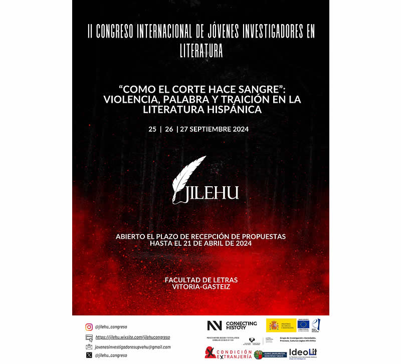 Los jóvenes investigadores de la Facultad de Letras de la UPV/EHU, en colaboración con el departamento de Filología e Historia, los grupos de investigación «Ideolit: La literatura como documento histórico: historia, ideología y texto» (GIU21/003) y «Sociedades, Procesos, Culturas (siglos VIII a XVIII)» (IT 1465-22) y los proyectos «Historia, ideología y texto en la poesía española de los ss. XX y XXI (Continuación)» (PID2022-138918NB-100), «Disrupciones y continuidades en el proceso de la modernidad, siglos XVI-XIX. Un análisis multidisciplinar (Historia, Arte, Literatura)» (PID2020-114496RB-I00) y «Condición de extranjería. Escritoras latinoamericanas, s. XXI, entre América y Europa» (PID2020-112913GB-100), convocamos el II Congreso Internacional de Jóvenes Investigadores en Literatura de la Universidad del País Vasco/Euskal Herriko Unibertsitatea: «Como el corte hace sangre»: Violencia, palabra y traición en la literatura hispánica. Esta segunda edición nace con un interés fundamental: el de profundizar en el conocimiento de la violencia, sus diferentes realizaciones, sus modos de aplicación y su plasmación en las distintas literaturas hispánicas. En esta nueva edición se proponen como objeto de estudio tres periodos de nuestra historia literaria (Edad Media, Siglos de Oro y Literatura Contemporánea) y dos grandes bloques geográficos que son, además, históricos y políticos: la literatura hispánica peninsular y la literatura hispanoamericana. Por esto hablamos, no sin cierta duda, de «literaturas hispánicas», producidas en español, aunque a uno y otro lado del Atlántico.