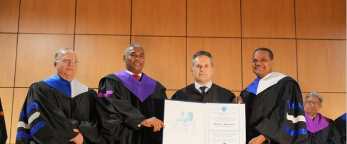 La Universidad Autónoma de Santo Domingo (UASD), fiel a su compromiso con la excelencia académica y la valoración del mérito intelectual, confirió el Título de Profesor Honorario al Doctor Esteban Anchústegui Igartua, en reconocimiento a su destacada trayectoria como docente e investigador, y a sus aportes al desarrollo académico de la institución.