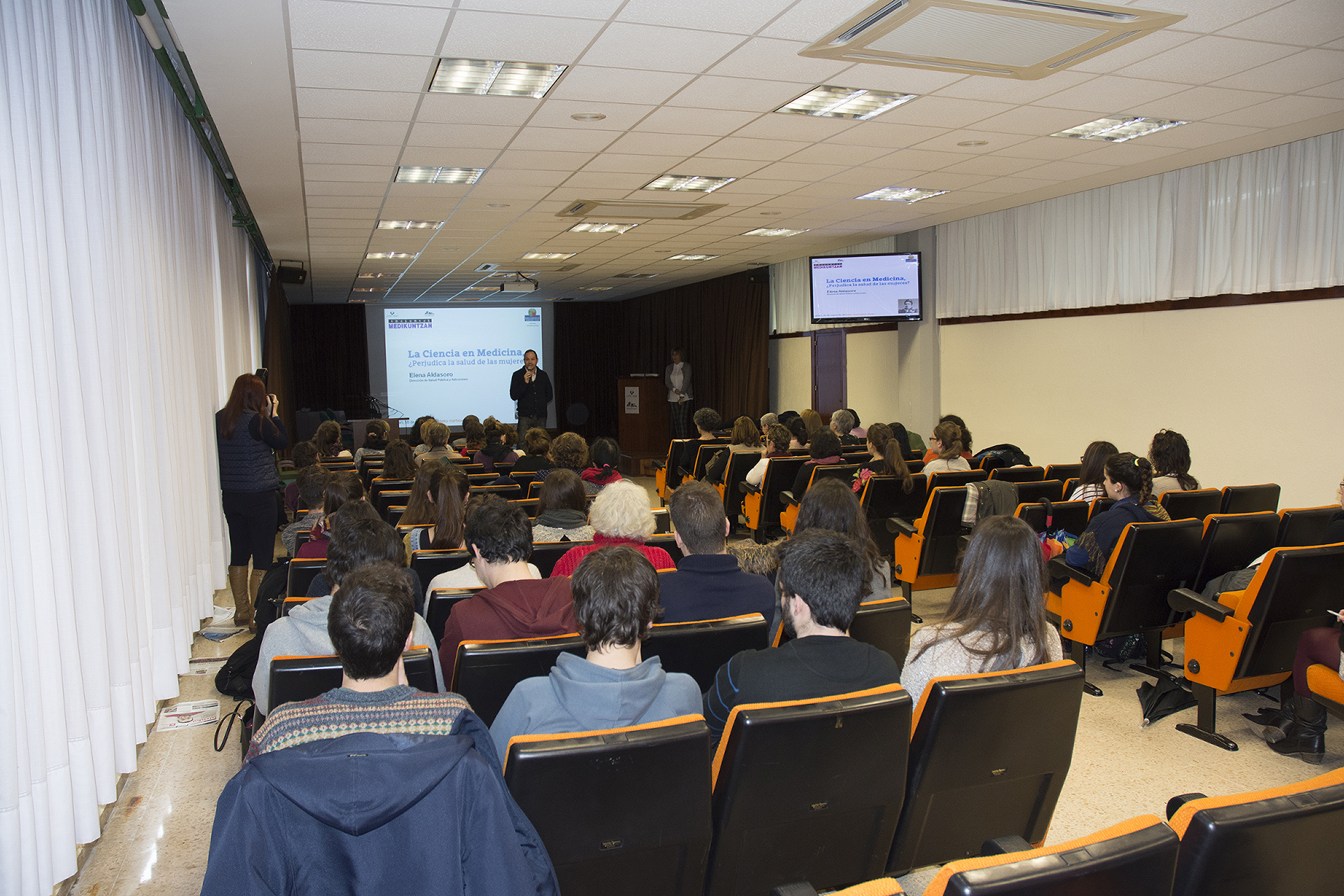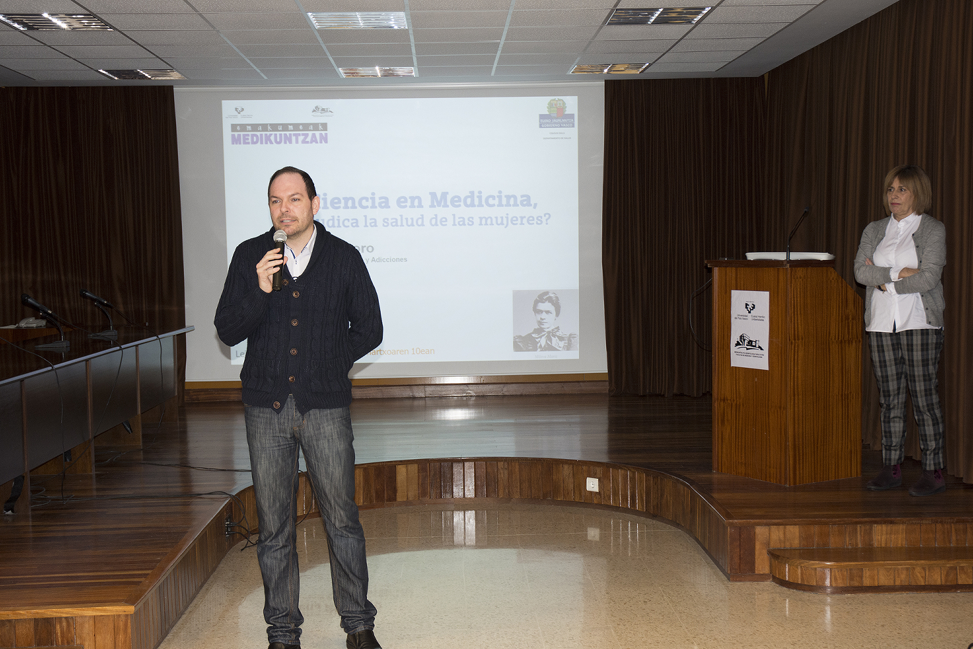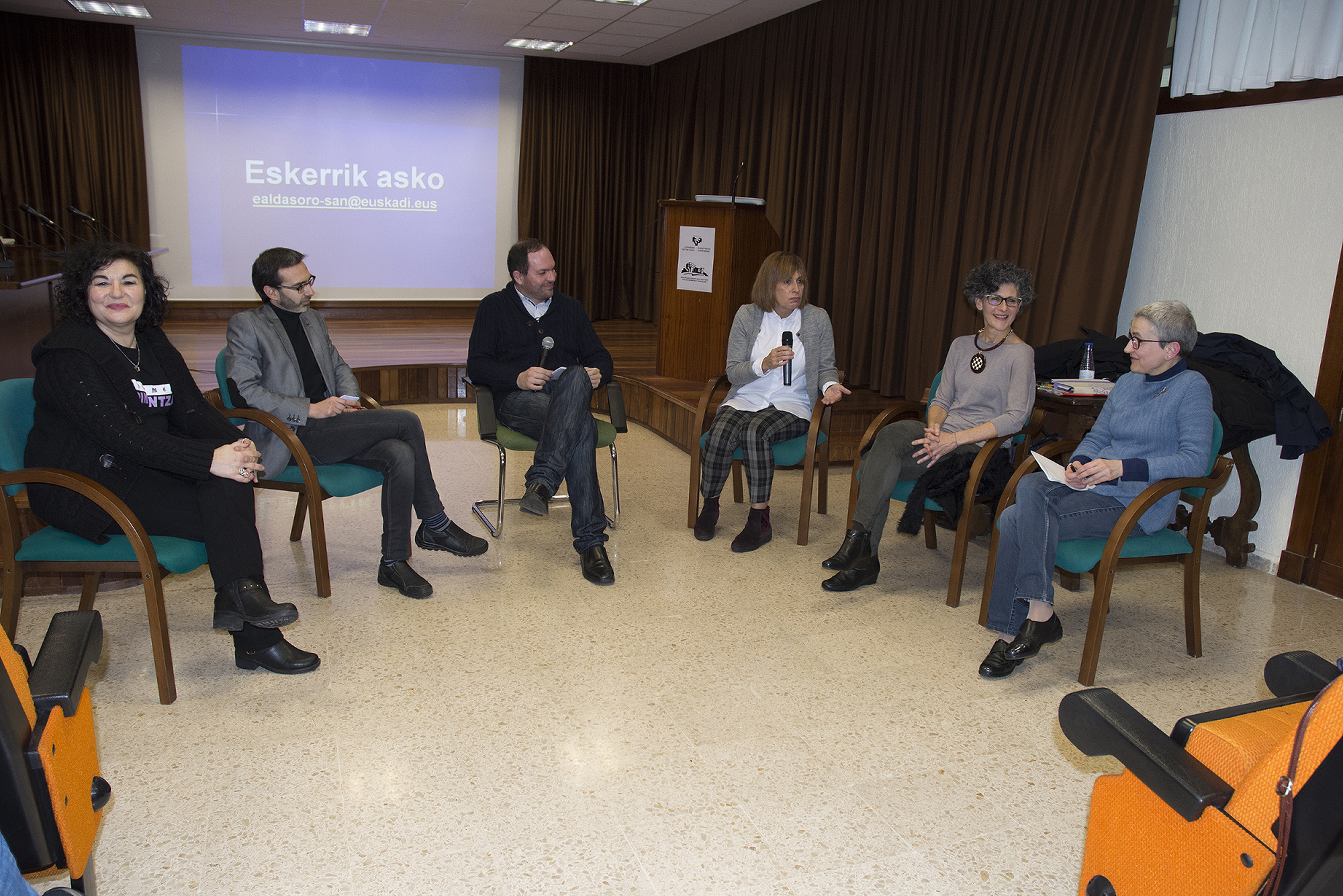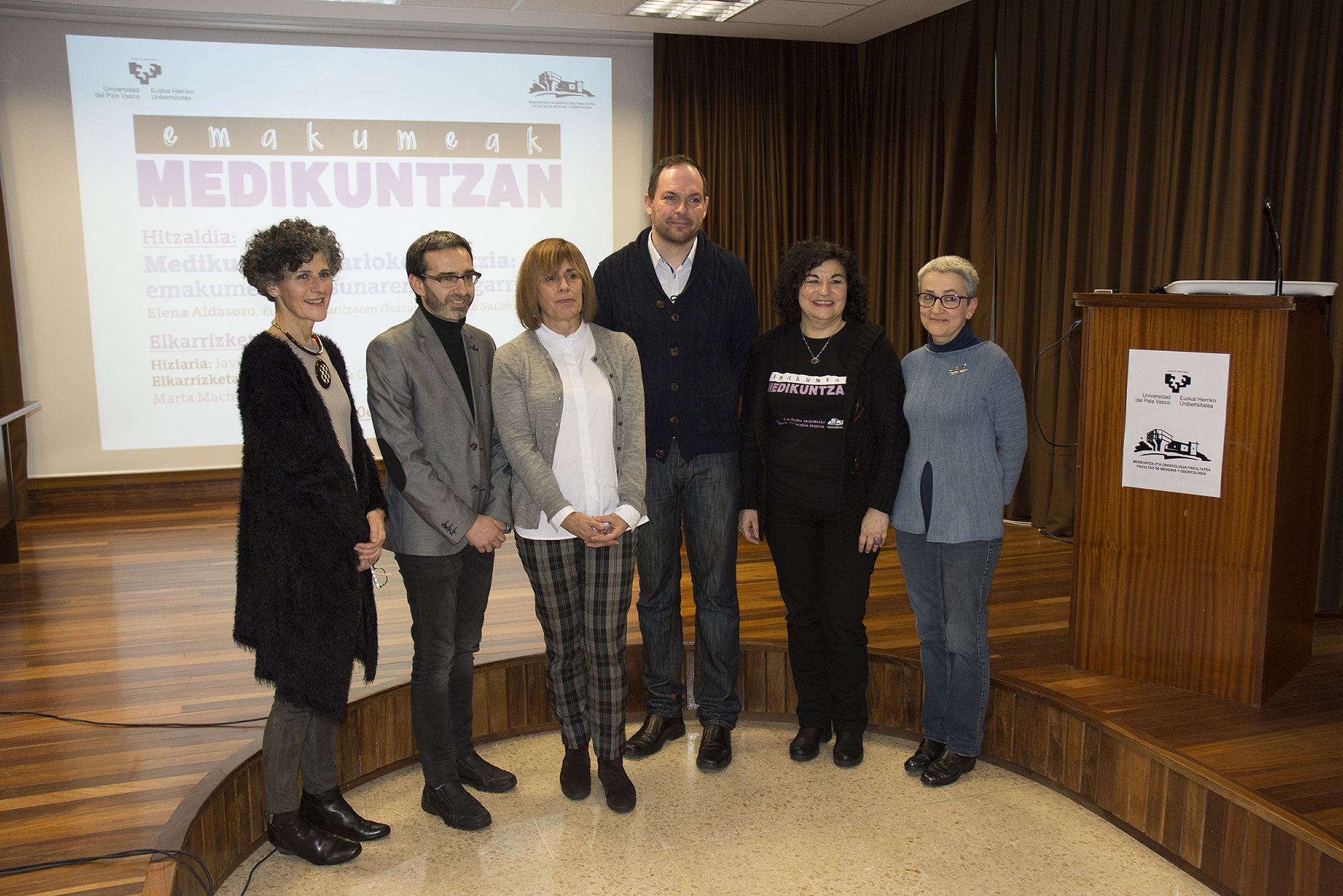 Elena Aldasoro aportó diversos datos acerca de la importancia del enfoque de género en la investigación en el área de la salud. Después se desarrolló un animado debate en torno al tema de la charla, moderado por Javier San Martín y con la participación de la propia Elena Aldasoro, Lucía Gallego, Iker Badiola, Elena Díaz Ereño, Marta Macho y el público asistente.