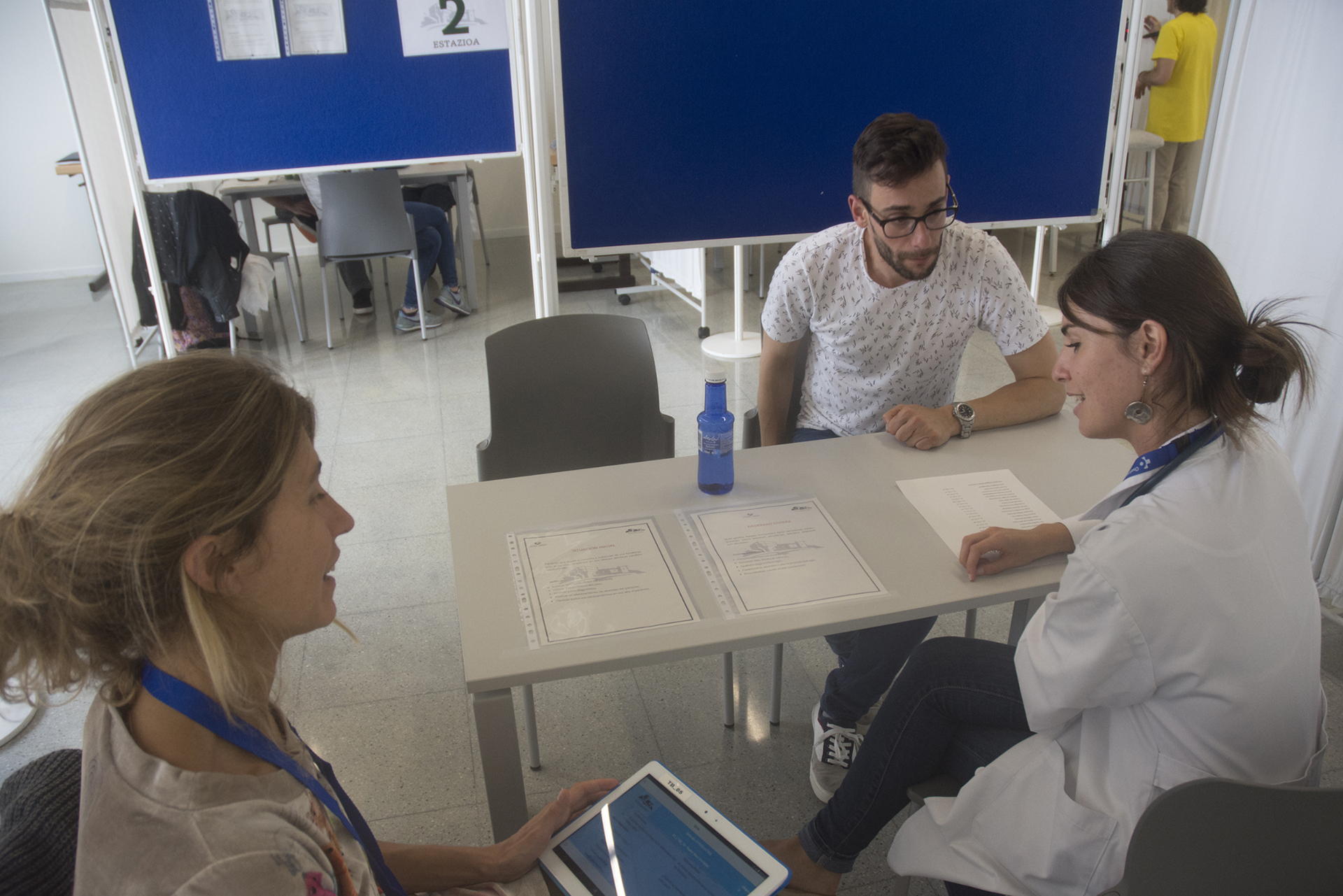 "Los pasados 6, 7 y 8 de junio de 2016 se celebro la primera prueba de Evaluación de competencias Clínicas Objetiva y Estructurada ECOE, que se realiza por la Facultad de Medicina y Enfermería de la Universidad del País Vasco. La realización de la prueba ha movilizado toda la fuerza y capacidad de organización de la Facultad, que ha implicado a la mayoría del personal (tanto PAS como PDI), así como a los 263 alumnos matriculados en el último curso del Grado de Medicina. La prueba implica la simulación de 20 situaciones clínicas o estaciones, para lo que hemos contado con la colaboración académica de gente de la escena de la talla de Loli Astoreka, Gurutze Beitia, Esther Velasco, Sol Maguna, Jose Luis Cuesta, Itziar Lazkano y Begoña Crego.