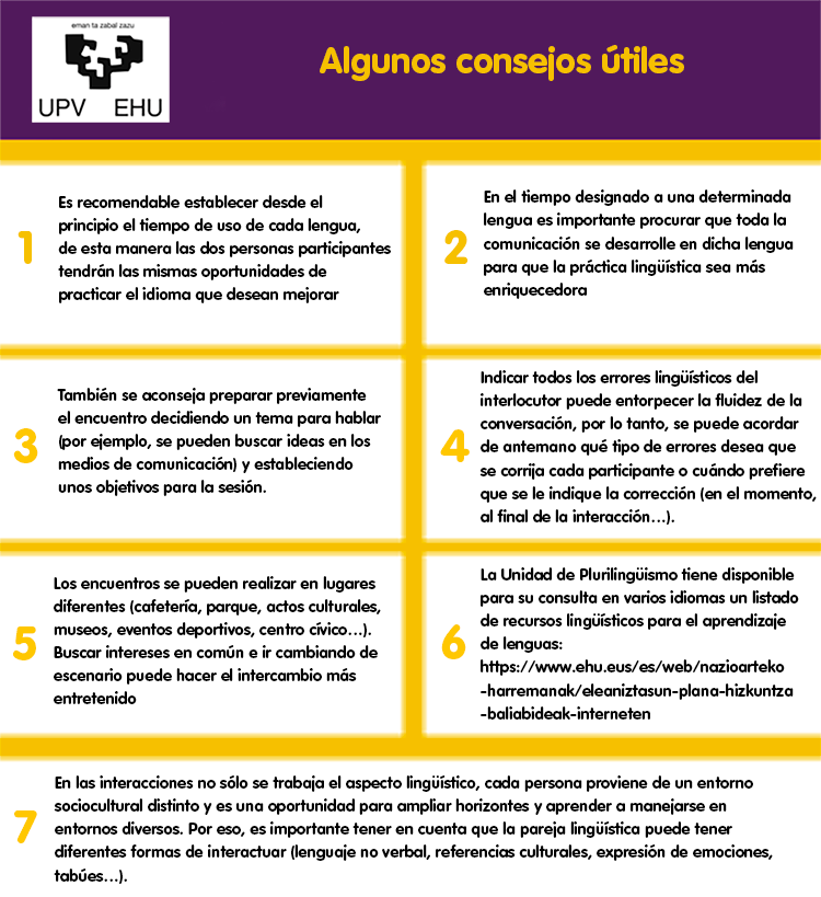 Presentamos un servicio gratuito que pretende fomentar el intercambio de conocimientos lingüísticos y culturales entre personas de lenguas distintas. Este sistema permite, a estudiantes nacionales e internacionales de la UPV/EHU, relacionarse y complementar su proceso de aprendizaje de idiomas perfeccionando la expresión oral, al tiempo que se desarrollan competencias interculturales.