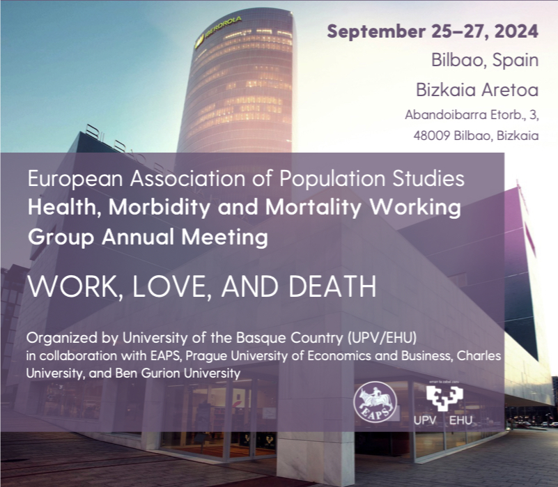 La Annual meeting of the European Association for Population Studies, Health, Morbidity, and Mortality Working Group son unas jornadas anuales organizadas por la European Association for Population Studies (EAPS). Este año, el Departamento de Sociología y Trabajo Social de la UPV/EHU será la responsable, junto con la EAPS, Charles University de Praga, la Prague University of Economics and Business y el National Institue for Reserach on Socioeconomics, de su organización en el Bizkaia Aretoa de Bilbao los días 25-27 de septiembre de 2024.