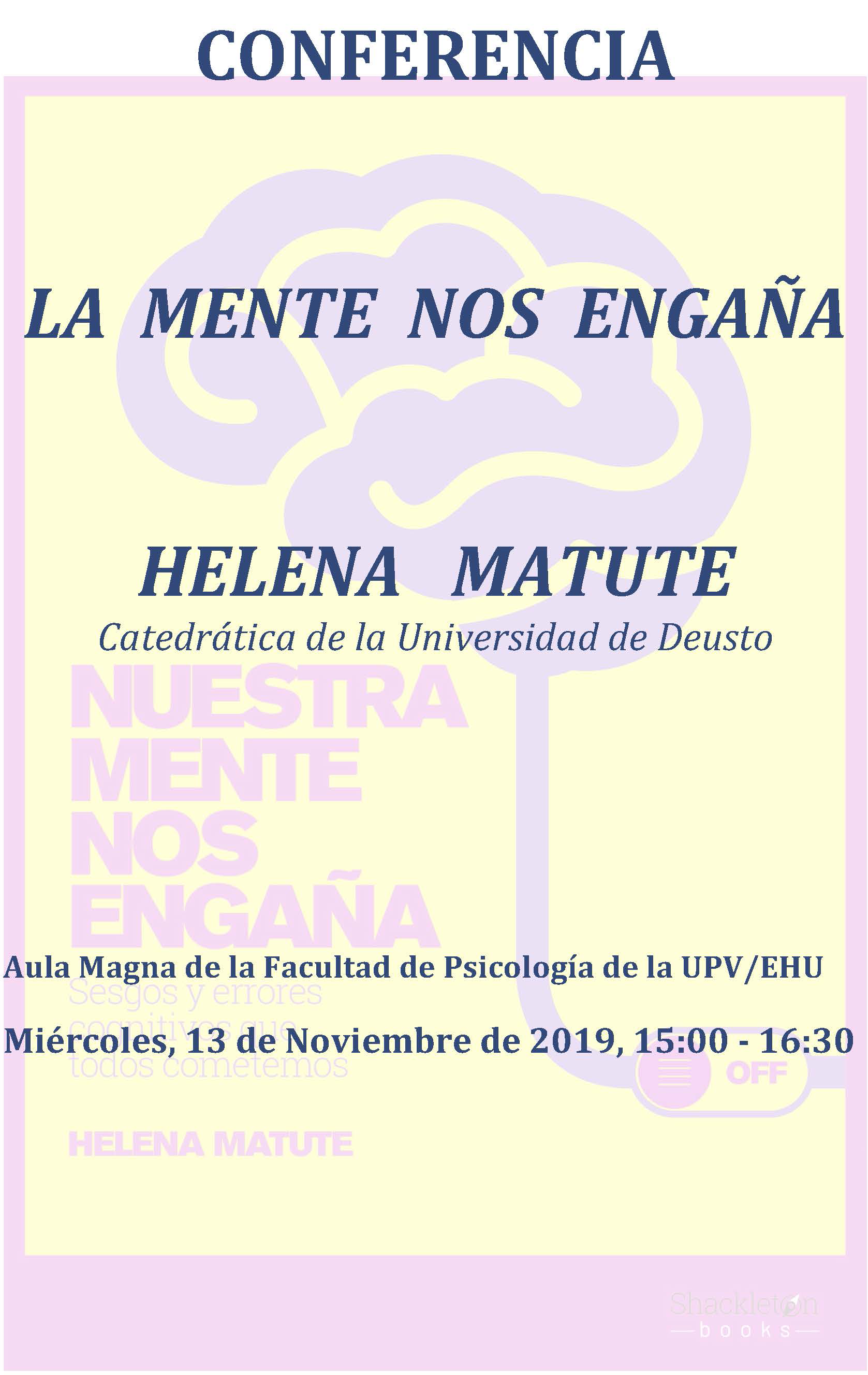 El miércoles 13 de noviembre, la Catedrática de la Universidad de Deusto, Helena Matute, impartirá la conferencia que lleva por título "La mente nos engaña". El acto comenzará a las 15:00 en el Aula Magna de la Facultad de Psicología de la UPV/EHU.