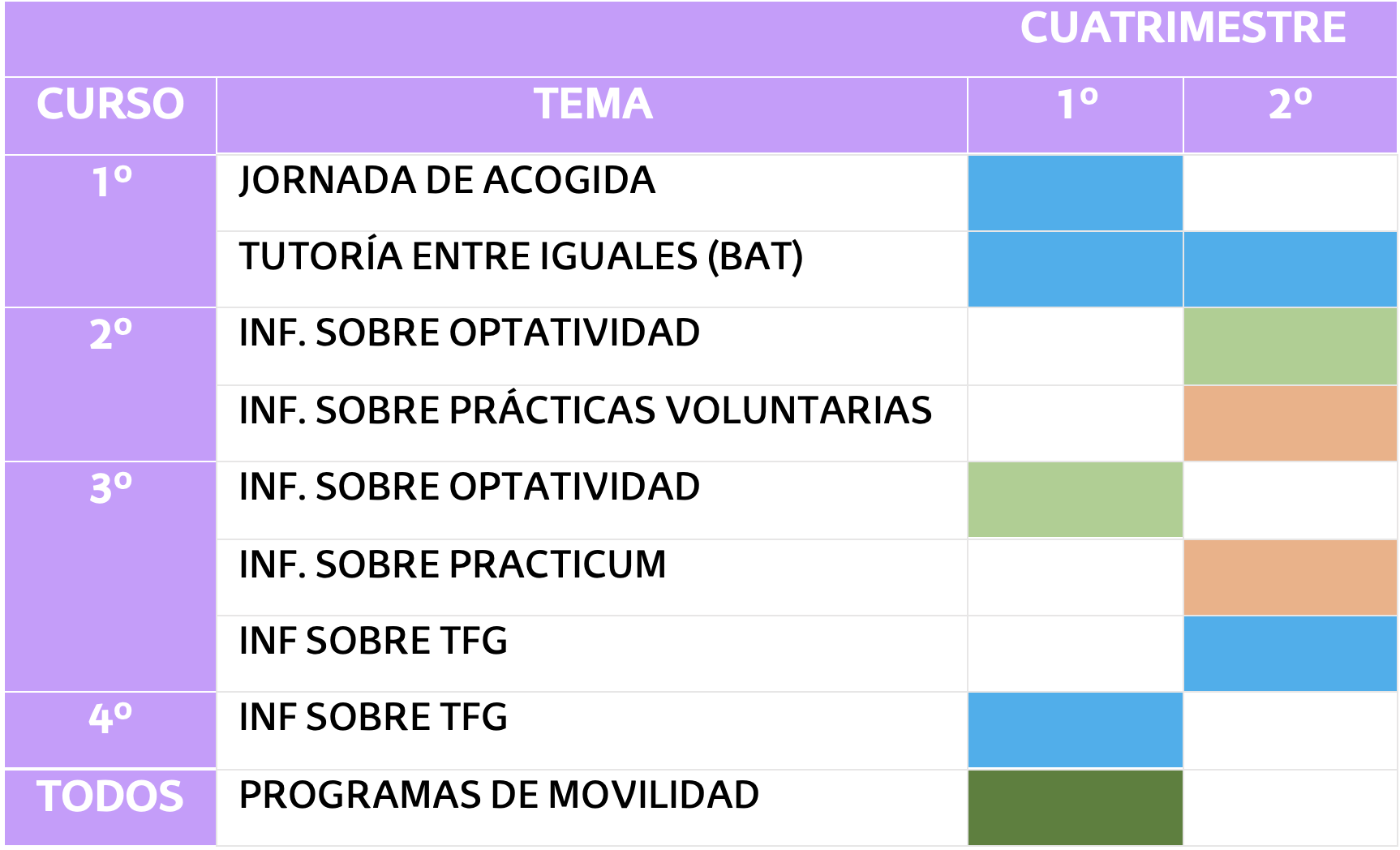 SESIONES INFORMATIVAS PARA EL ESTUDIANTADO. A lo largo del Grado, la Facultad organiza sesiones informativas para el estudiantado referentes a los distintos temas de interés para el mismo. El objetivo de estas actividades es ofrecer una atención personalizada al estudiante a través de actividades de información, asesoramiento y guía que favorezcan su integración en el centro, su desarrollo curricular y personal, así como su transición al mundo laboral y de la formación permanente.