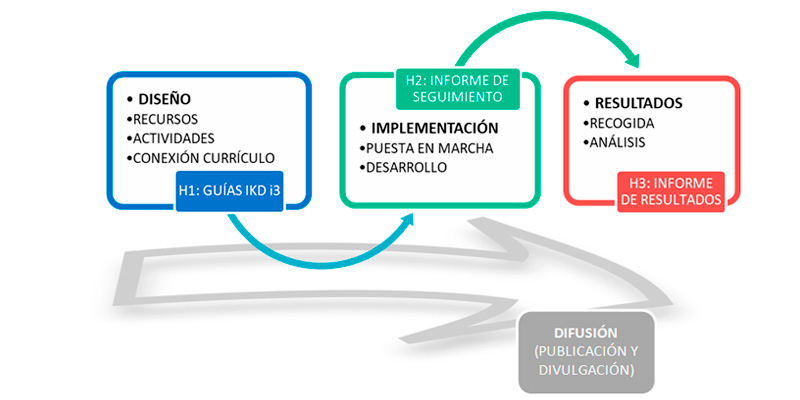 (1) Fase de diseño y planificación de las acciones de inserción curricular. Dicha fase culminará con la redacción de las guías docentes y/o guías del estudiante i3, que constituirán el primer hito de los proyectos (H1). Se deberá redactar un informe donde se especificarán las modificaciones realizadas en las guías docentes y/o guías del estudiante.