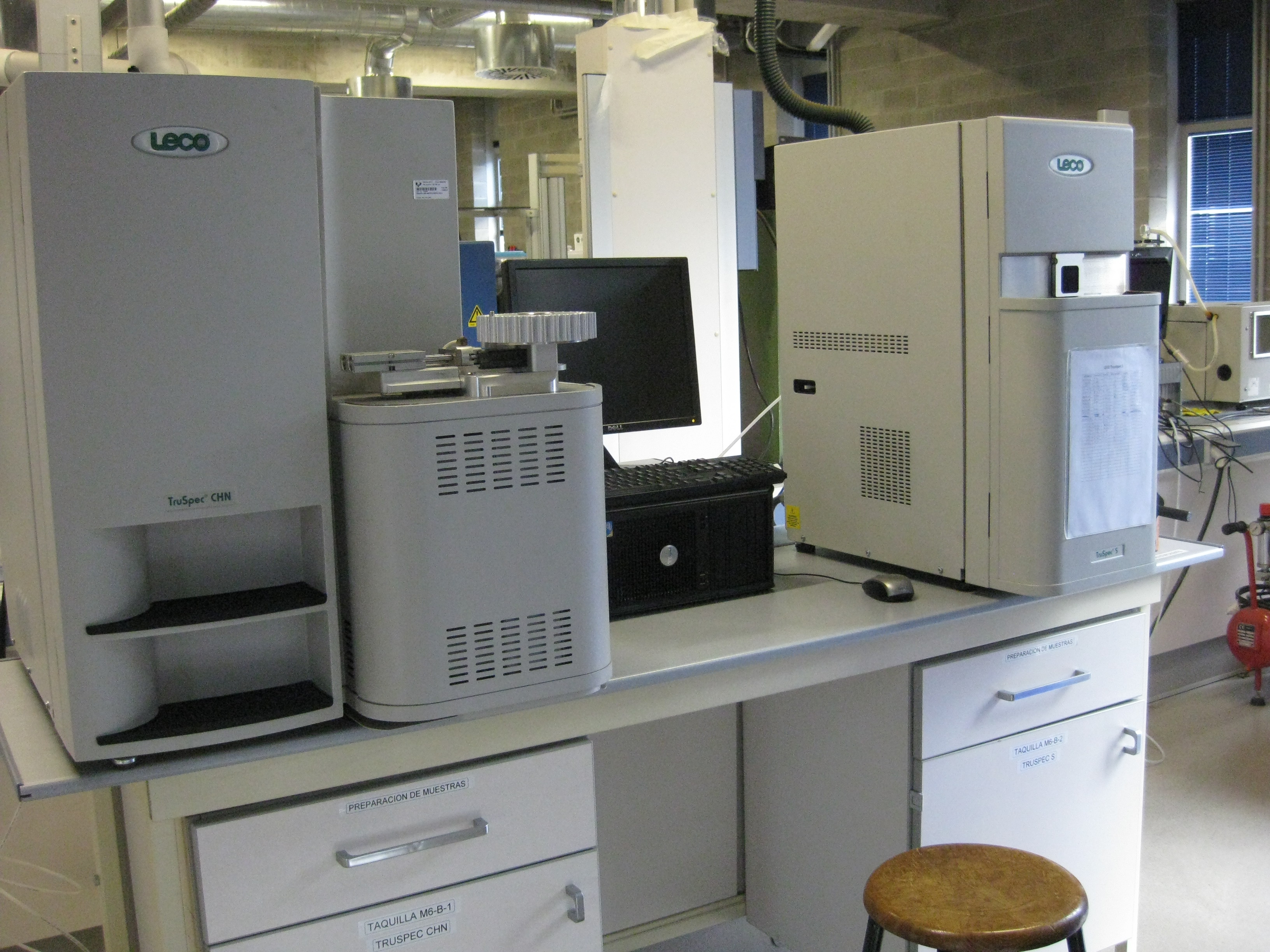 - Aparato LECO para análisis automático de combustibles sólidos y líquidos: determinación de C, H, N y S (TruSpec CHNS).
