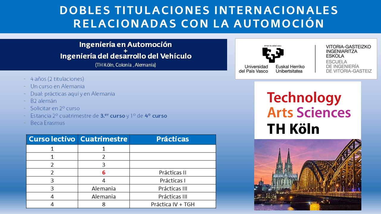 DOBLES TITULACIONES INTERNACIONALES Doble Grado en Ingeniería en Automoción + Ingeniería del desarrollo del Vehículo (TH Köln, Colonia, Alemania) (Abre una nueva ventana)Convenio UPV/EHU y TH Köln ---- Doble Grado en Ingeniería en Automoción + Ingeniería del desarrollo del Vehículo (pdf ,1,31 Mb) Doble Grado en Ingeniería Mecánica + Ingeniería del desarrollo del Vehículo (TH Köln, Colonia , Alemania) (Abre una nueva ventana)Convenio UPV/EHU y TH Köln --- Doble Grado en Ingeniería Mecánica + Ingeniería del desarrollo del Vehículo (pdf ,961,75 Kb)