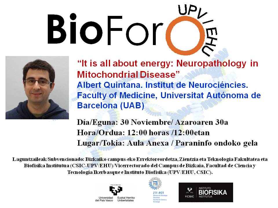 BioForo "It is all about energy: Neuropathology in Mitochondrial Disease", Albert Quintana (Institut de Neurociéncies, Universitat Autónoma de Barcelona).